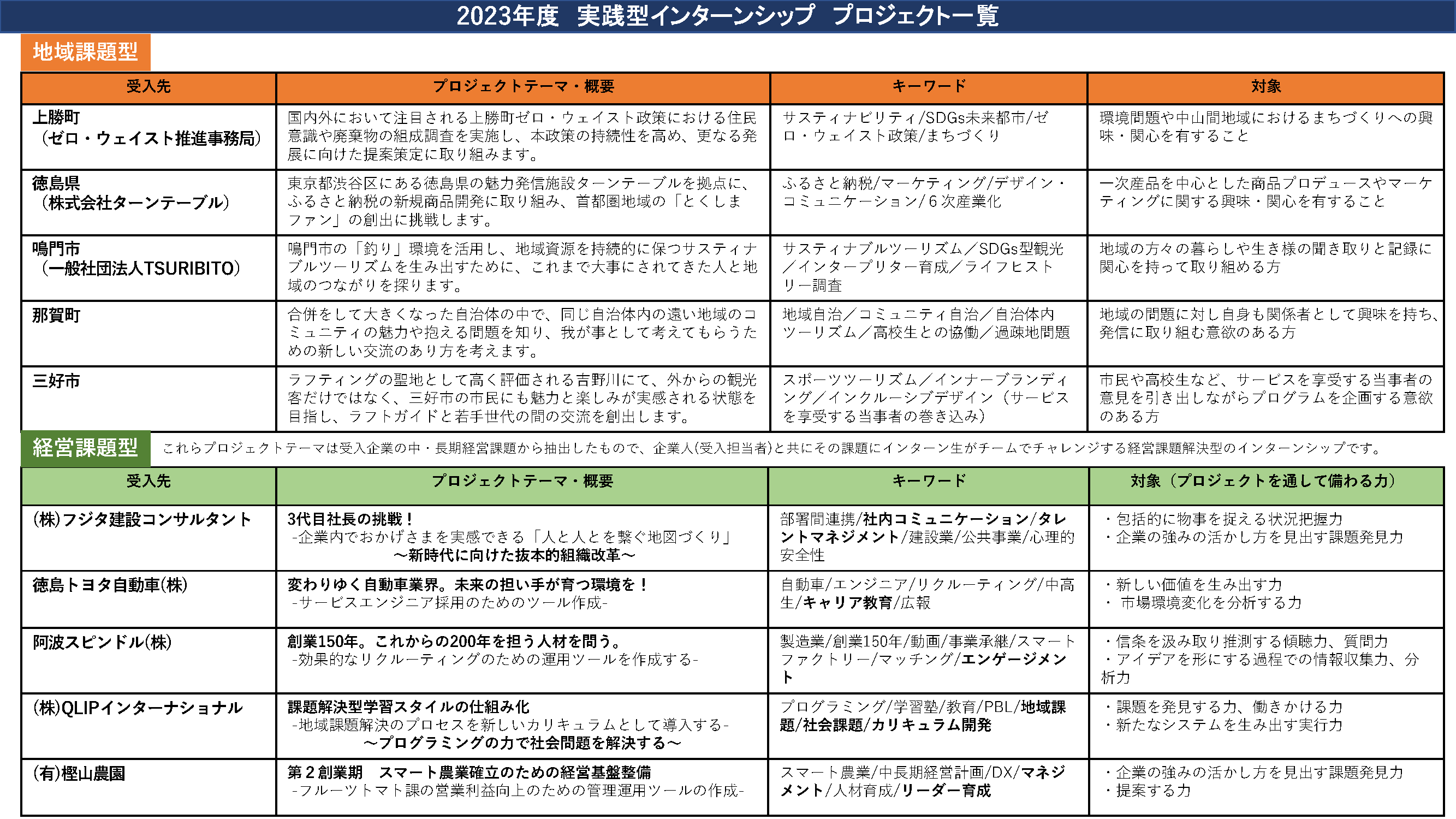 徳島県内の企業・自治体が抱える課題に対して、インターンシップ先と学生チーム(学部・学年混合)が、中・長期にわたり協働して課題の解決を目指すプロジェクトベースのインターンシップです。
