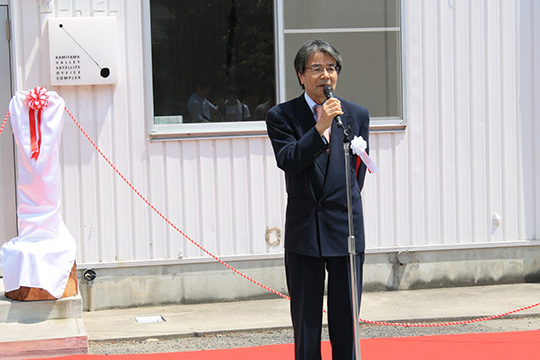 開設記念式典では、本学の香川征 学長、神山町の後藤正和 町長による挨拶があり、その後、本学学生及び関係者の約60名の参加者が見守る中、後藤町長、本学客員教授でもあるグリーンバレーの大南信也 理事長、徳島県総合大学校の安井俊之 本部長、香川学長、本学の吉田和文 理事・副学長、高石喜久 理事・副学長による看板除幕式が行われました。