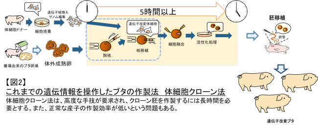 今日まで遺伝子改変ブタは、体細胞に遺伝子改変を行った後、体細胞クローン技術を用いて遺伝子改変クローン胚を作製し、それらを受胚ブタへ移植することで作製されてきました。しかしながら、標的となる遺伝子を改変した体細胞作製率は非常に低く、また、クローン胚作製には高度な手技を必要とし、たとえ熟練者であっても一度の移植に必要な約200個のクローン胚を作製するには長時間を必要としていました(図2)。さらに、体細胞クローン技術における決定的な欠点は、正常な産子の作製効率が非常に低いことで、遺伝子改変ブタの作製は難易度が高いのが現状でした。