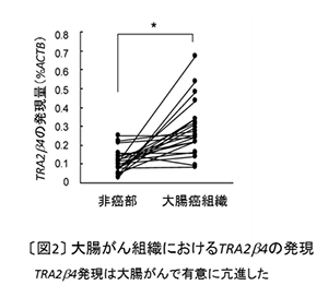 本研究では、マウスからヒトまでに100%保存されたゲノム領域(超保存領域)より転写された機能性RNA、T-UCRの生理的意義の解明を目指し、選択的スプライシング因子Transformer 2-beta (TRA2B)遺伝子より生成されるTRA2β4 RNAの機能解析を行いました。TRA2β4はエクソン2に超保存領域がコードされていますが、中途ストップコドンを含むため正規Tra2βタンパク質に翻訳されず、RNAの形で核に留まることを見出しました(図1)。TRA2β4は大腸がん組織に高発現しており(図2)、大腸がん細胞株HCT116においてsiRNAを用いて発現を減少させると、細胞増殖の低下及び細胞老化の誘導が確認されました(図3)。分子メカニズムとして、① TRA2β4はエクソン2の二次構造を介して転写因子Sp1に結合すること、② Sp1のデコイとして、細胞老化調節因子p21 (CDKN1A遺伝子)のプロモーターへの結合を阻害すること、を見出しました。これらの結果より、大腸がんで高発現するTRA2β4はp21を減少させ、細胞老化を低下させ細胞増殖を亢進させる可能性が示唆されました。
