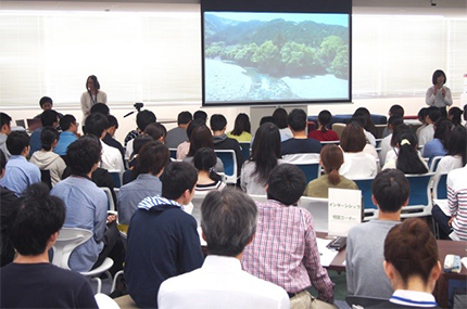 同フェアでは、学生の受入を希望する企業等が、学生に向けてそれぞれのプロジェクトに関するプレゼンテーションを行い、さらに個別のブースでプロジェクトの説明を行う場を設けました。