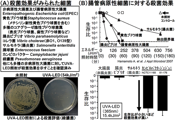 図2. UVA-LED照射による病原性細菌への殺菌効果