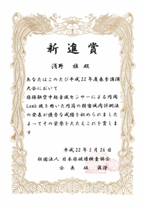 浅野雅さん@先端技術科学教育部機械創造システム工学コース(機械工学科)が,社団法人日本非破壊検査協会主催の平成22年度春季講演大会において, 新進賞を受賞しました。 非接触空中超音波センサーによる円周Lamb波を用いた円筒の精密減肉計測法