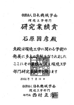 石原国彦教授@エネルギーシステム部門(機械工学科)が,社団法人日本機械学会において環境工学部門研究業績賞を受賞しました。