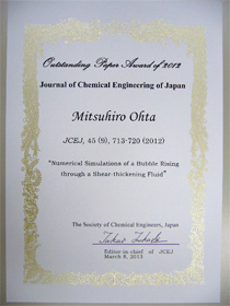 太田光浩教授@エネルギーシステム部門(機械工学科)が,Journal of Chemical Engineering of JapanよりOutstanding Paper Award of 2012を受賞しました。