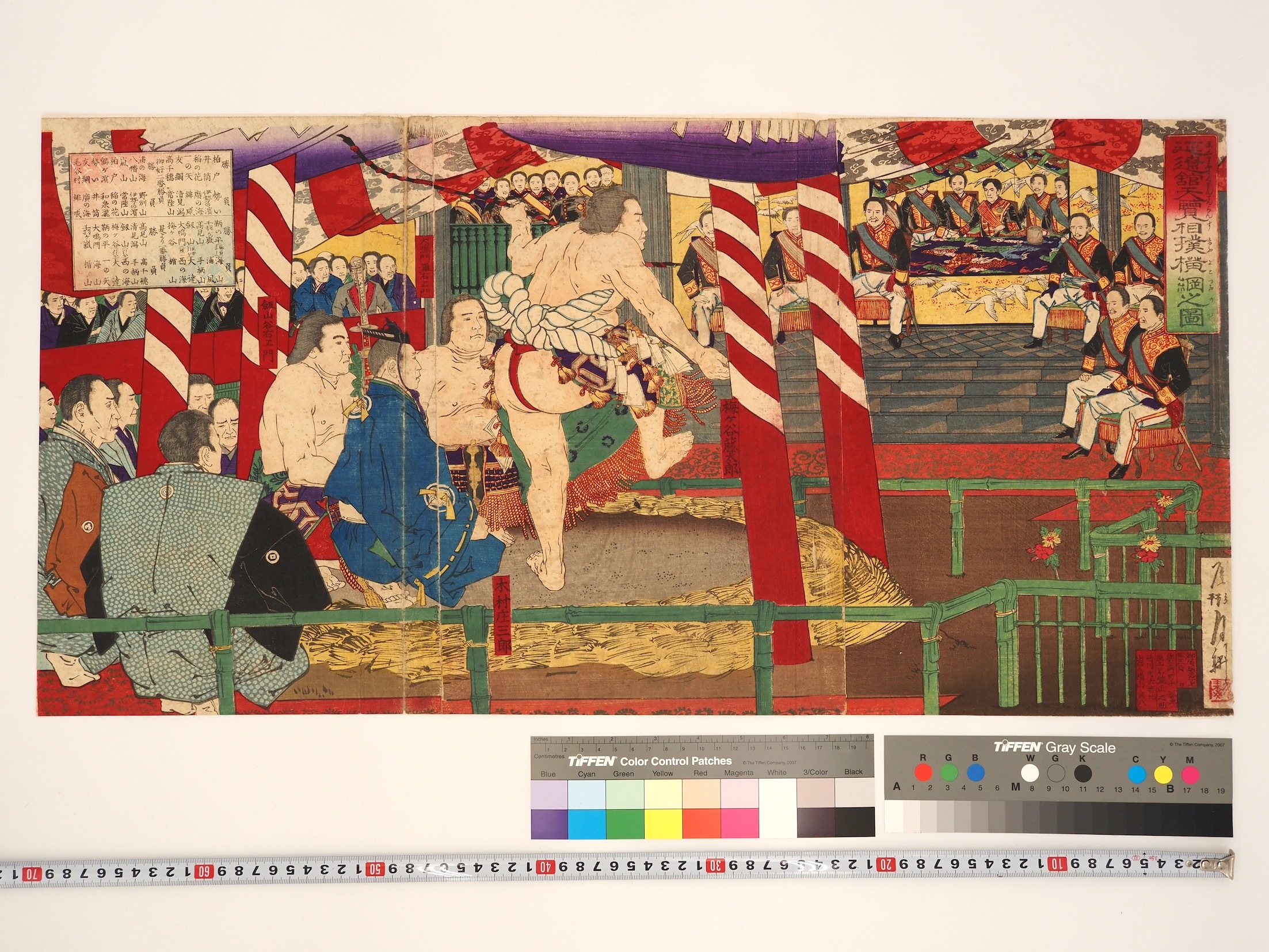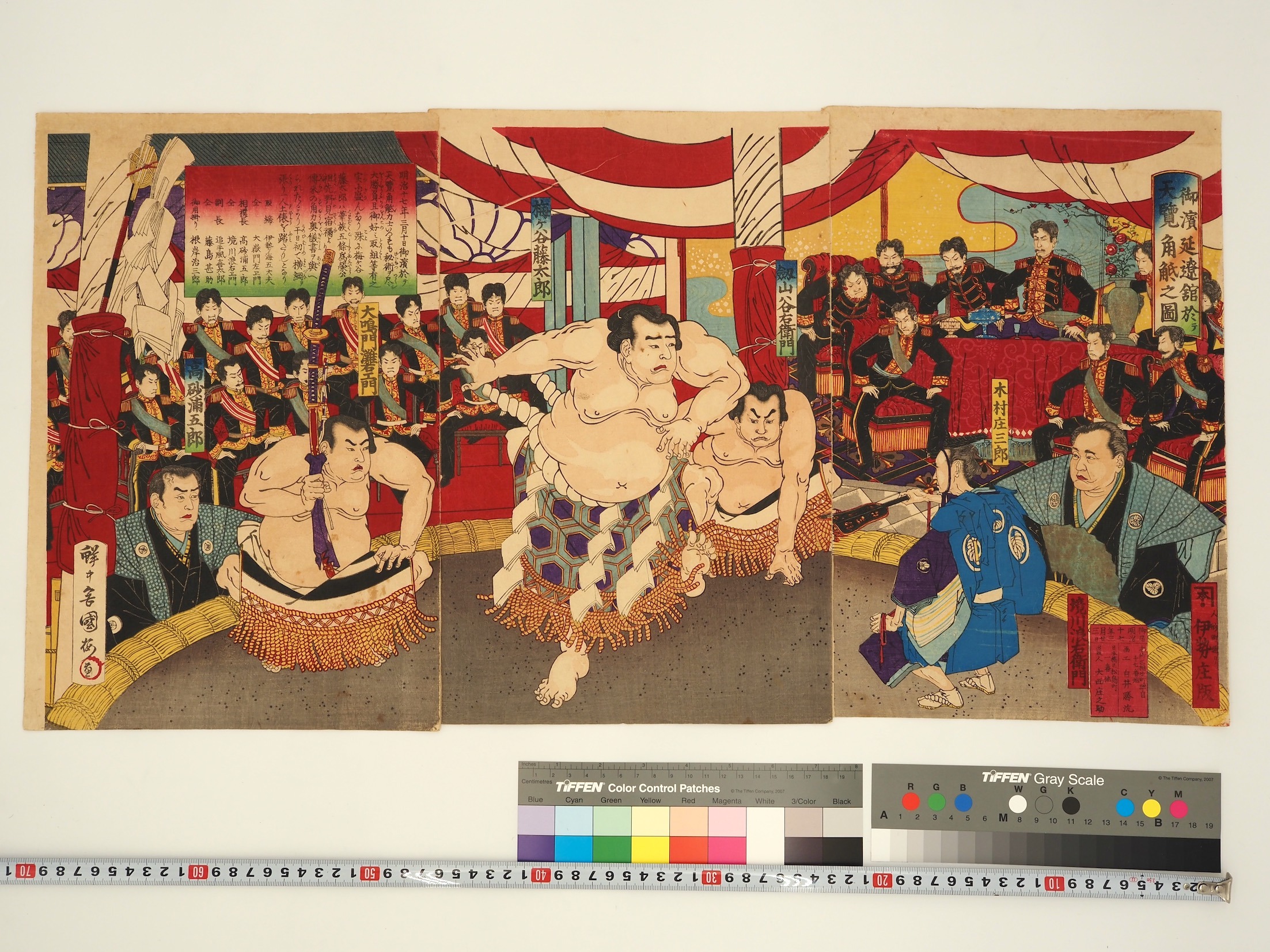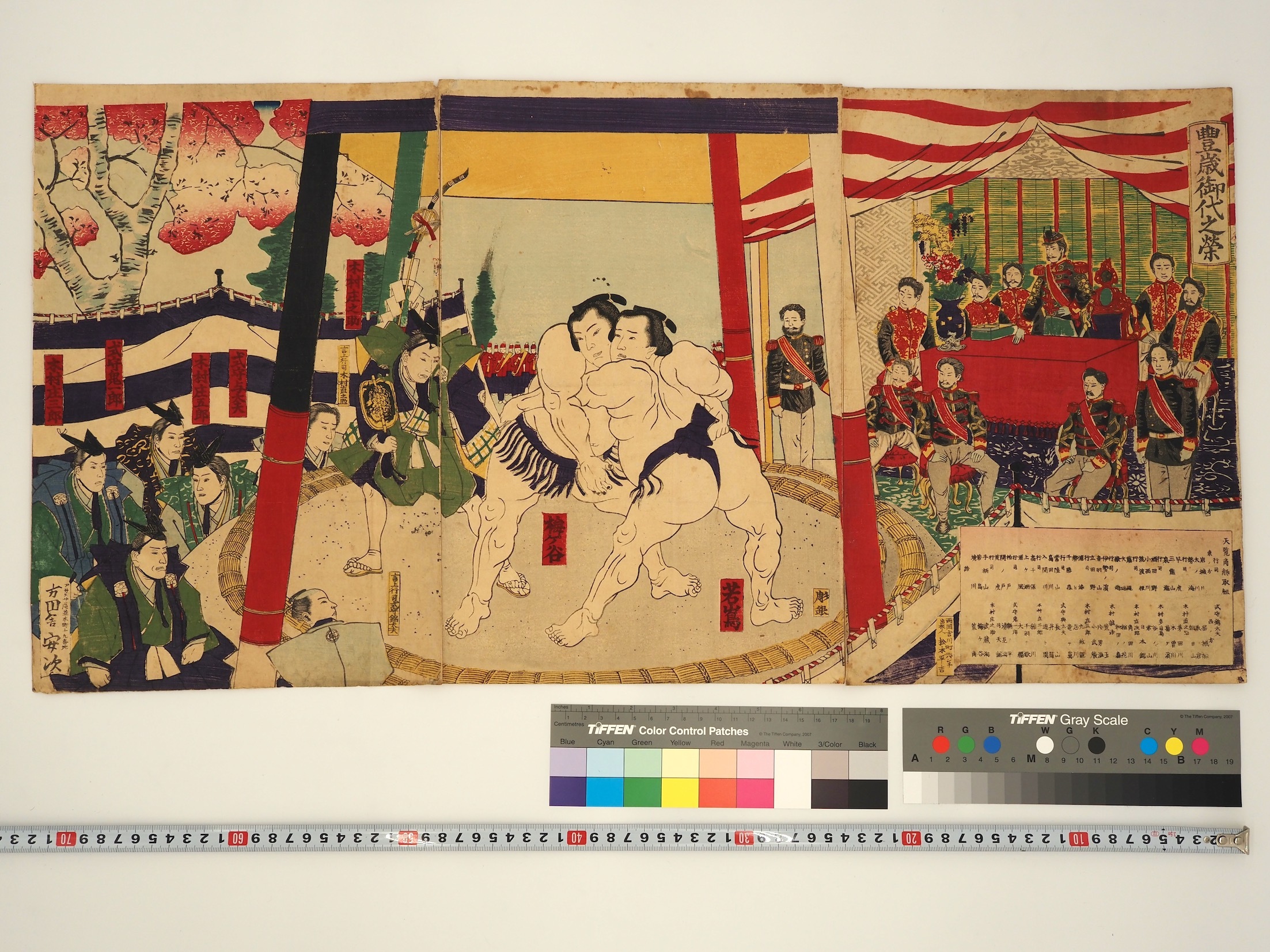 タイトル「豊歳御代之榮(梅ヶ谷と若島の天覧取組図)」 タイトル「豊歳御代之榮(梅ヶ谷と若島の天覧取組図)」 P10-4B/井上 探景(安治)/豊歳御代之榮(梅ヶ谷と若島の天覧取組図)/大黒屋(松木)平吉/明治17年/A/O/3枚続
