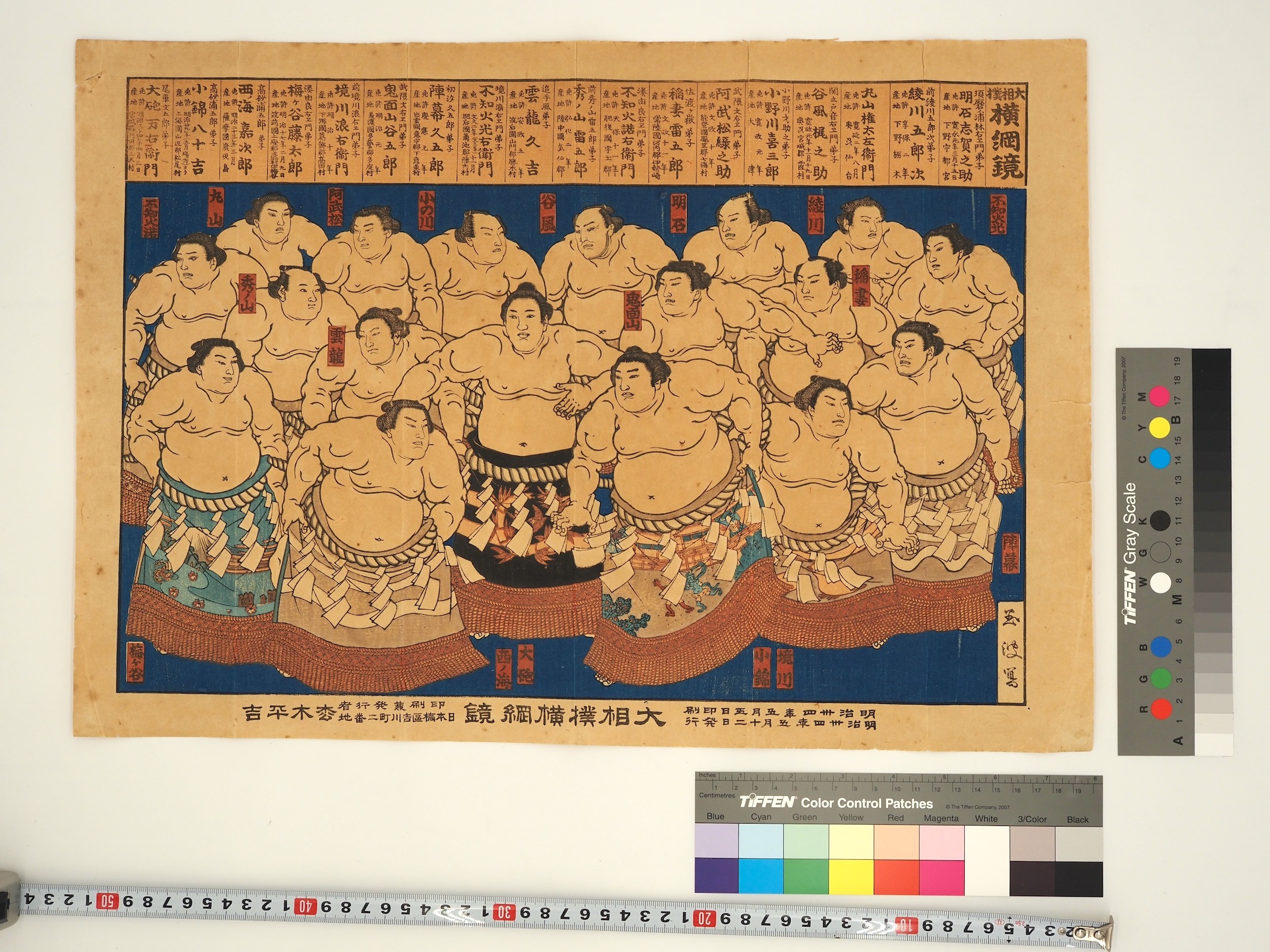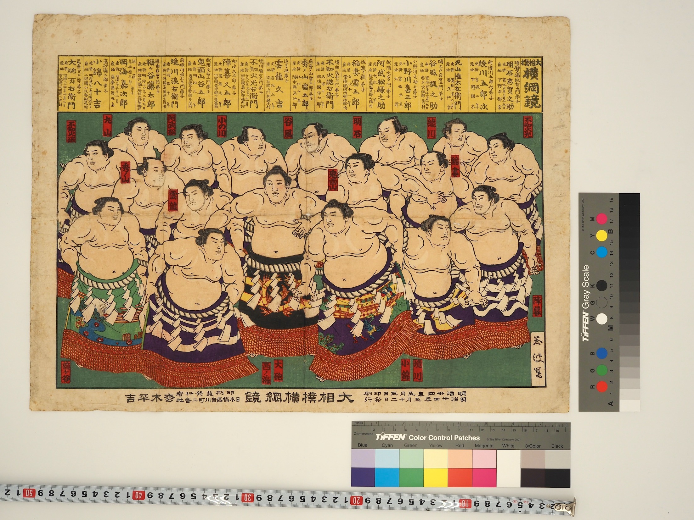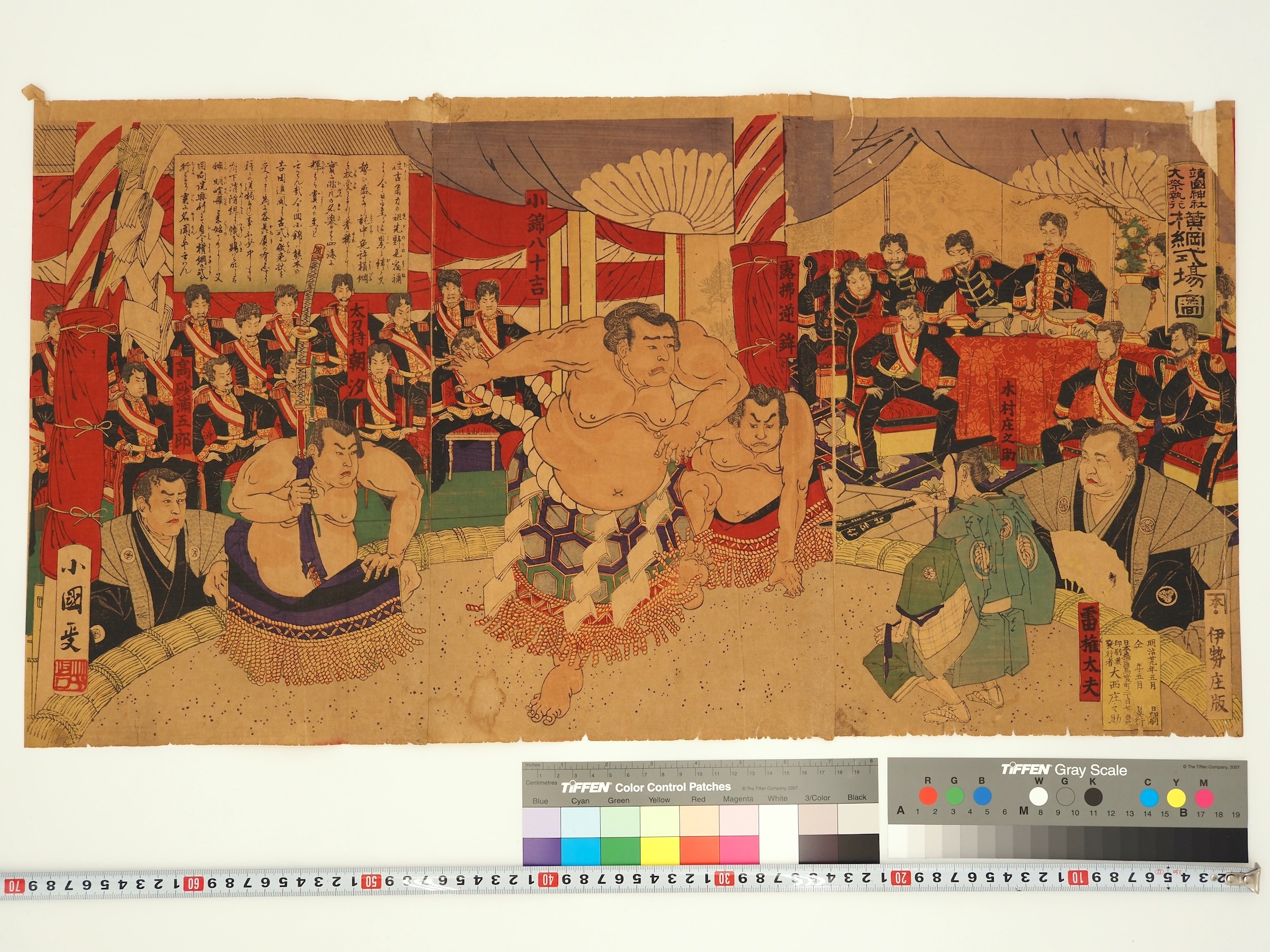 タイトル「豊歳御代之榮(梅ヶ谷と若島の天覧取組図)」 タイトル「豊歳御代之榮(梅ヶ谷と若島の天覧取組図)」 P10-4B/井上 探景(安治)/豊歳御代之榮(梅ヶ谷と若島の天覧取組図)/大黒屋(松木)平吉/明治17年/A/O/3枚続