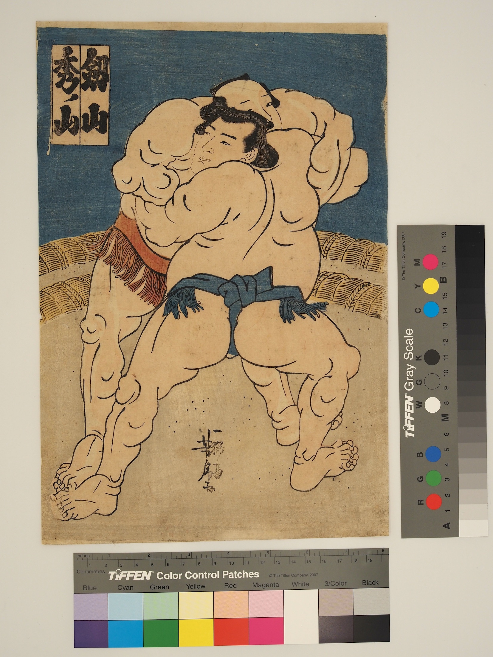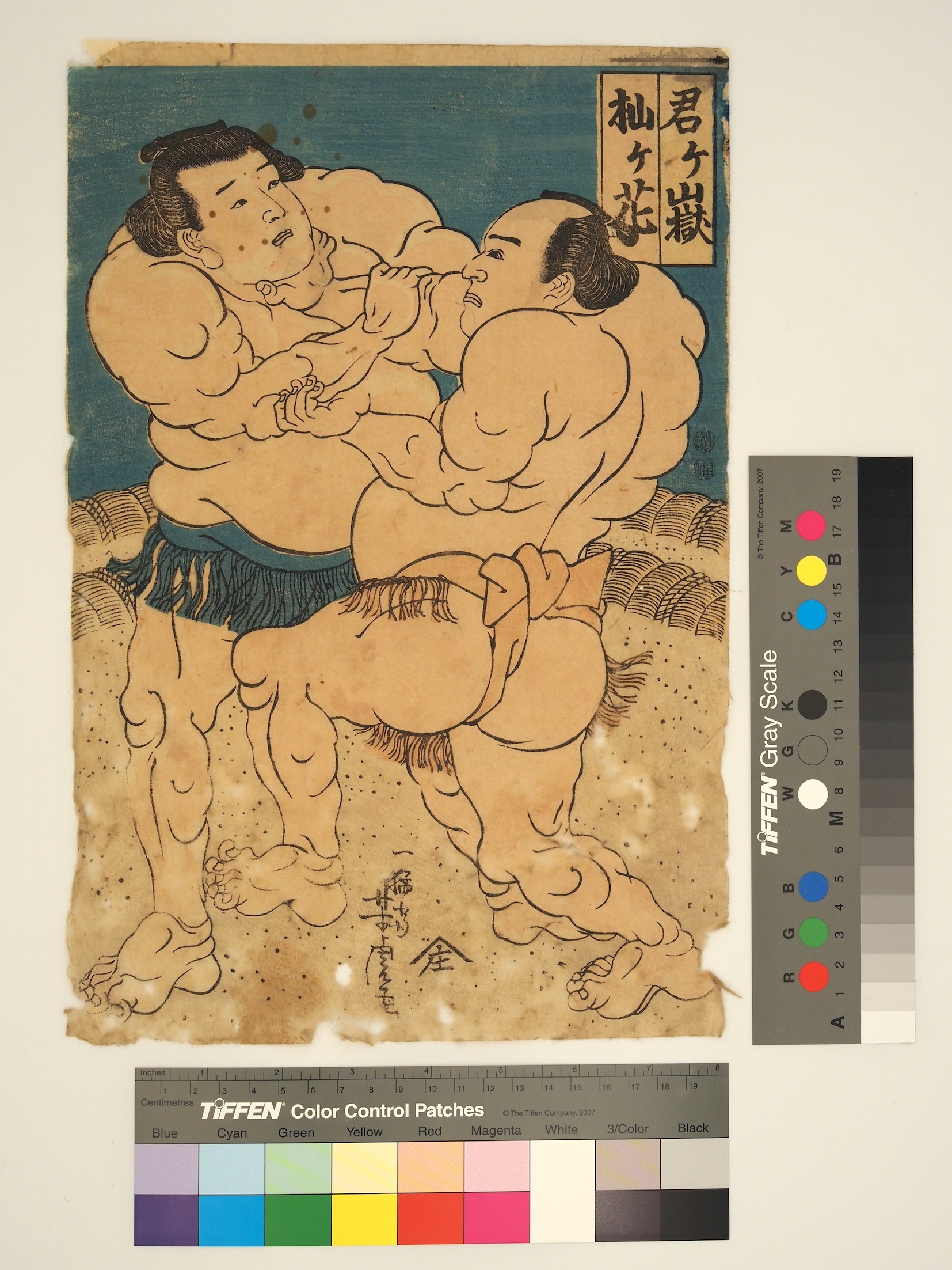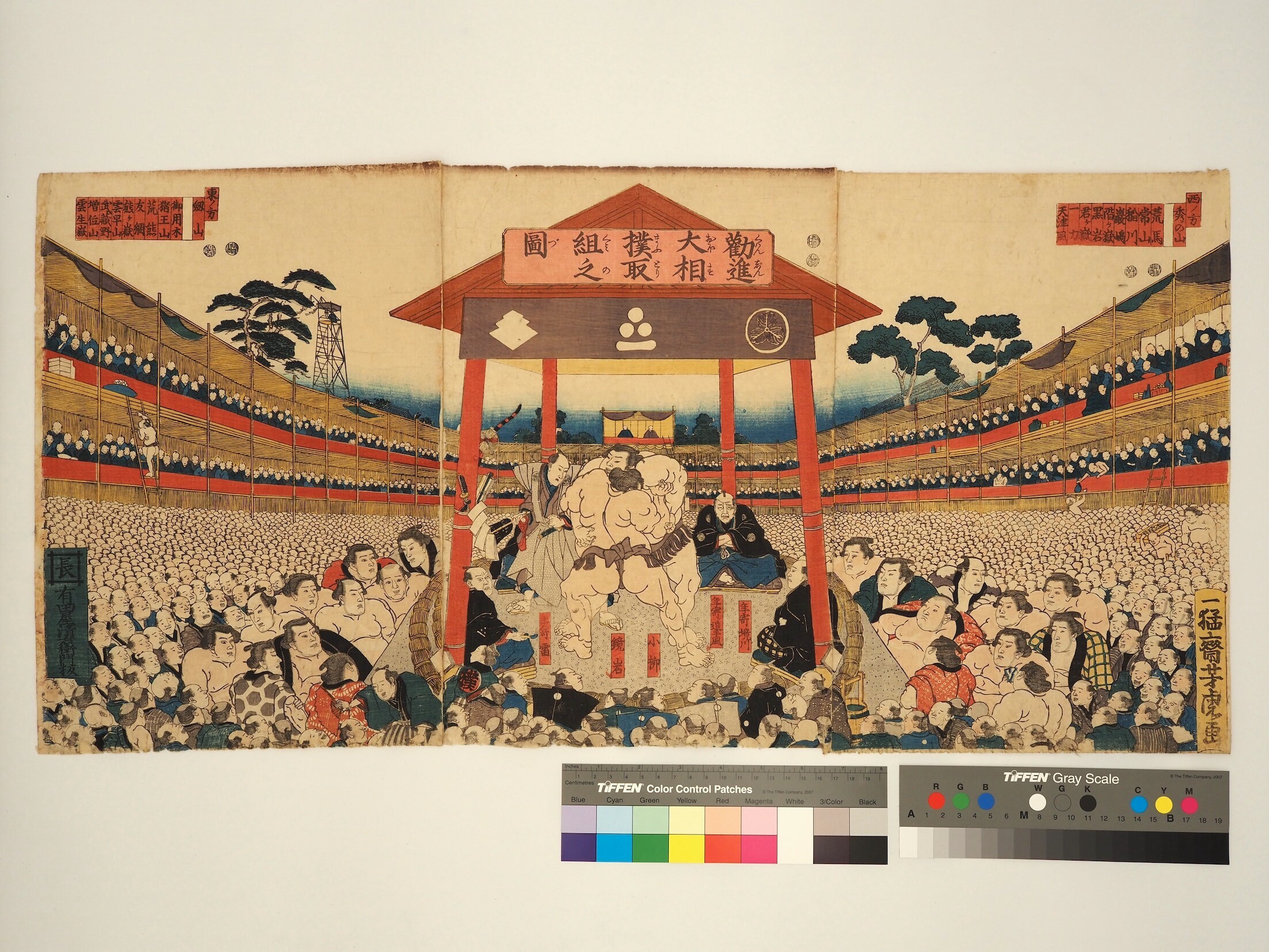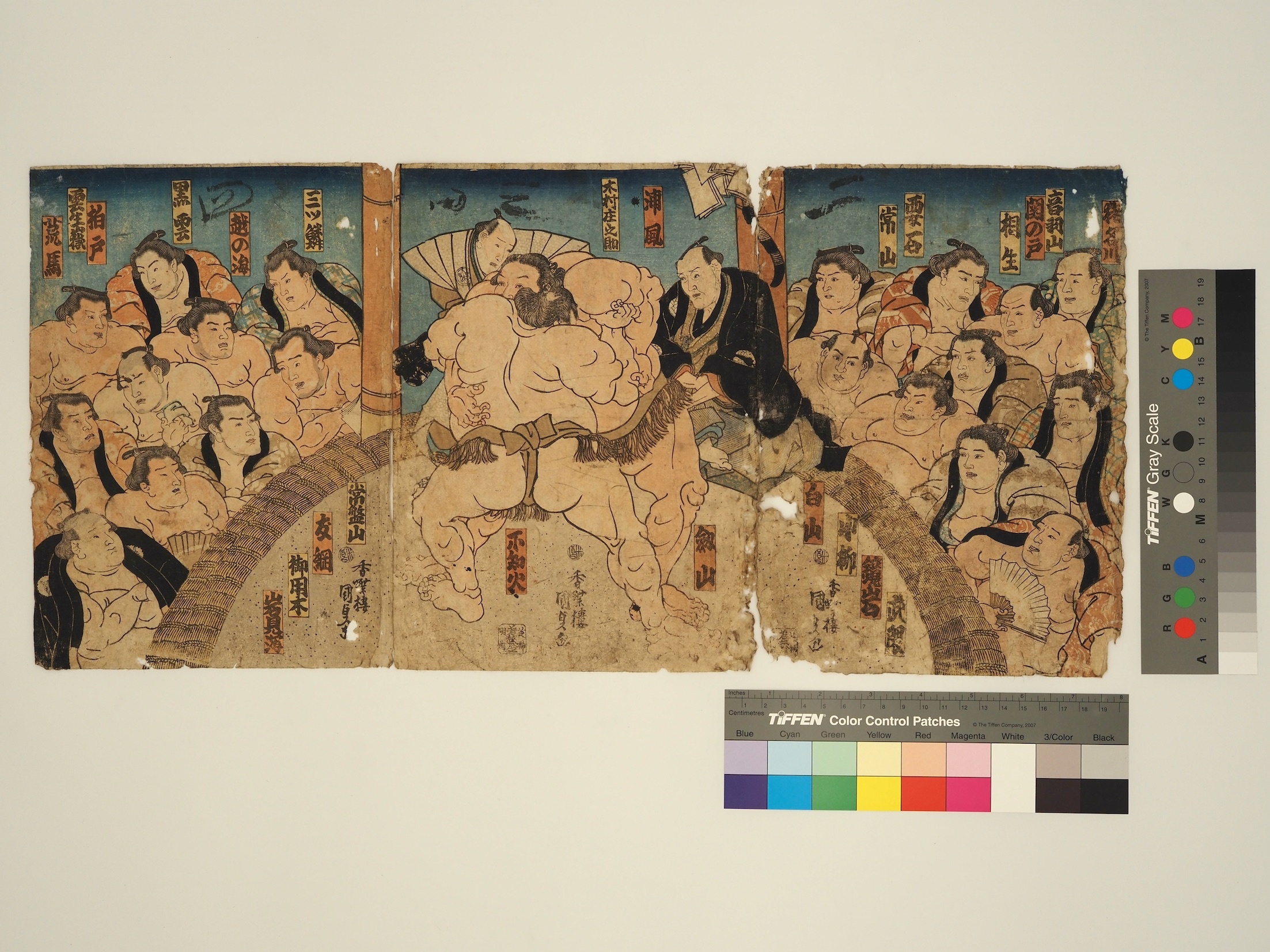 タイトル「(不知火諾右衛門と剣山谷右衛門の取組図)」 タイトル「(不知火諾右衛門と剣山谷右衛門の取組図)」 P2-2-1/歌川 国貞(初代)/豊国(三代)/(不知火諾右衛門と剣山谷右衛門の取組図)/若狭屋与市/天保14年/A/O/中判3枚続