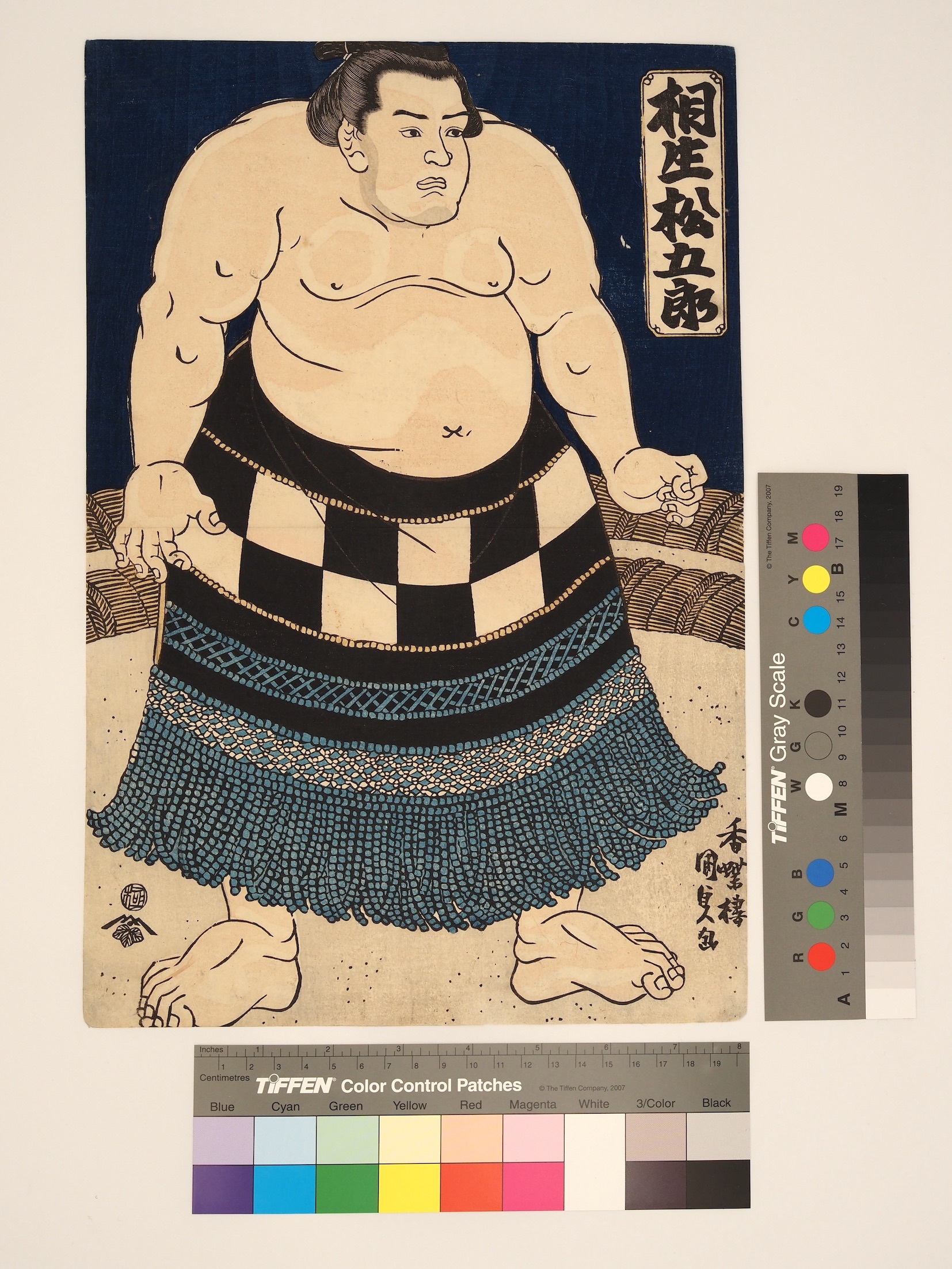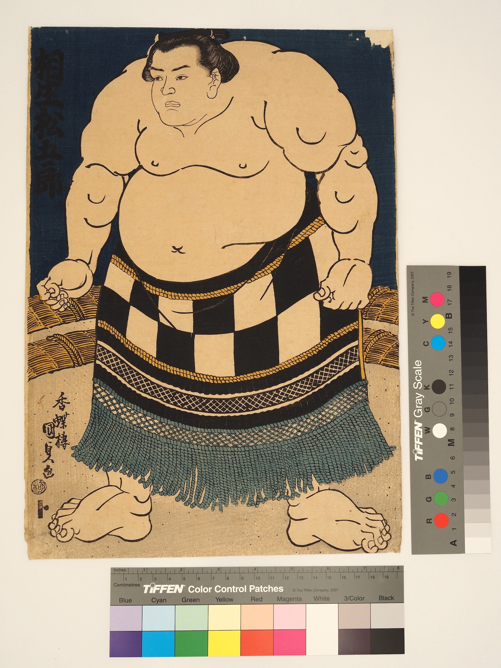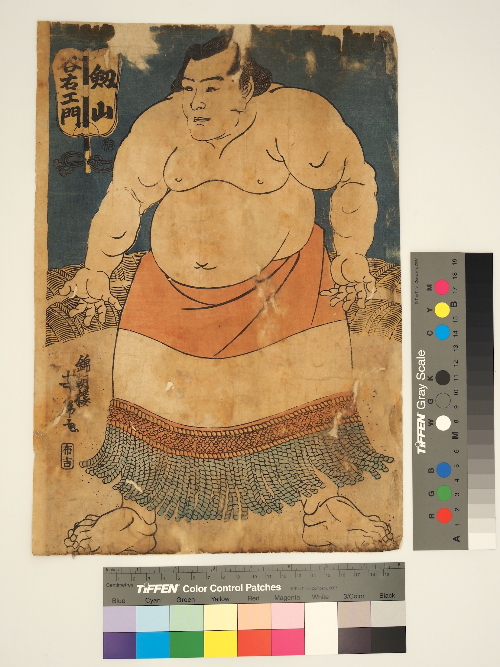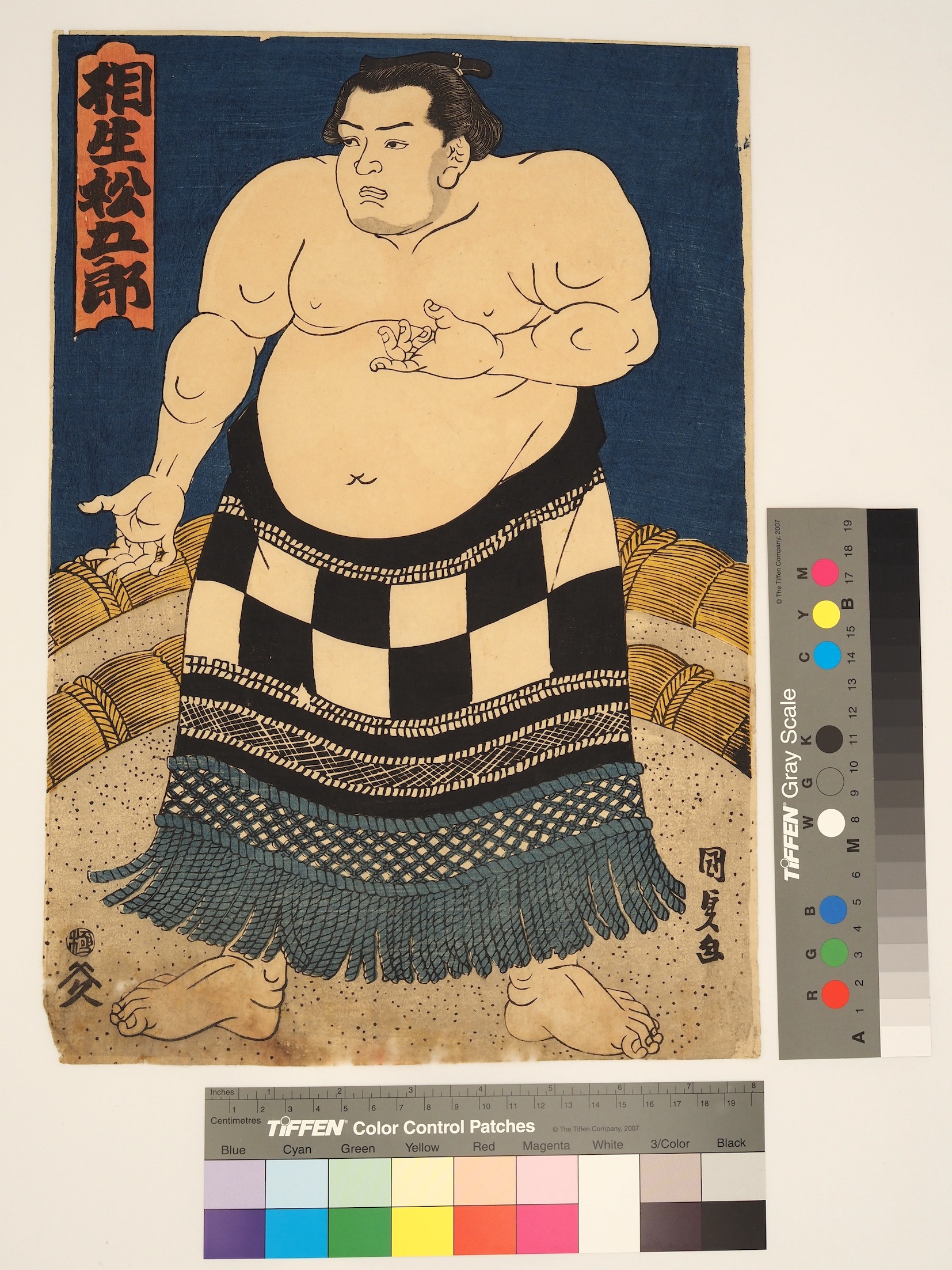 タイトル「(不知火諾右衛門と剣山谷右衛門の取組図)」 タイトル「(不知火諾右衛門と剣山谷右衛門の取組図)」 P2-2-1/歌川 国貞(初代)/豊国(三代)/(不知火諾右衛門と剣山谷右衛門の取組図)/若狭屋与市/天保14年/A/O/中判3枚続