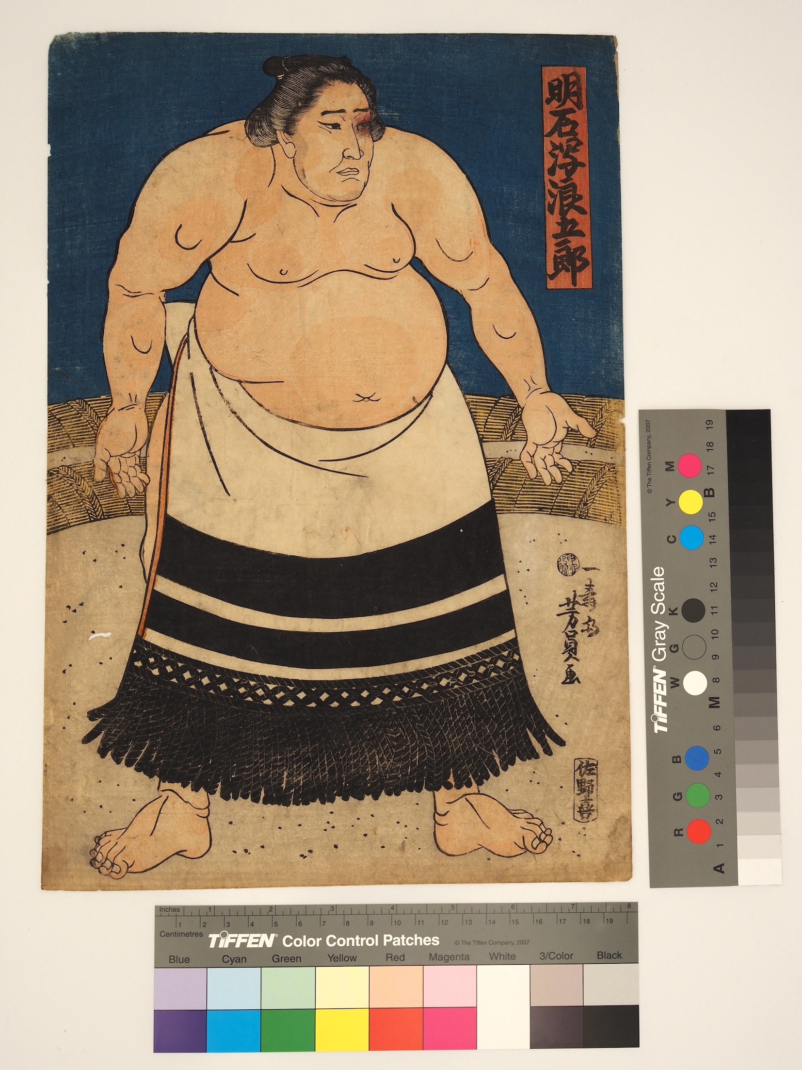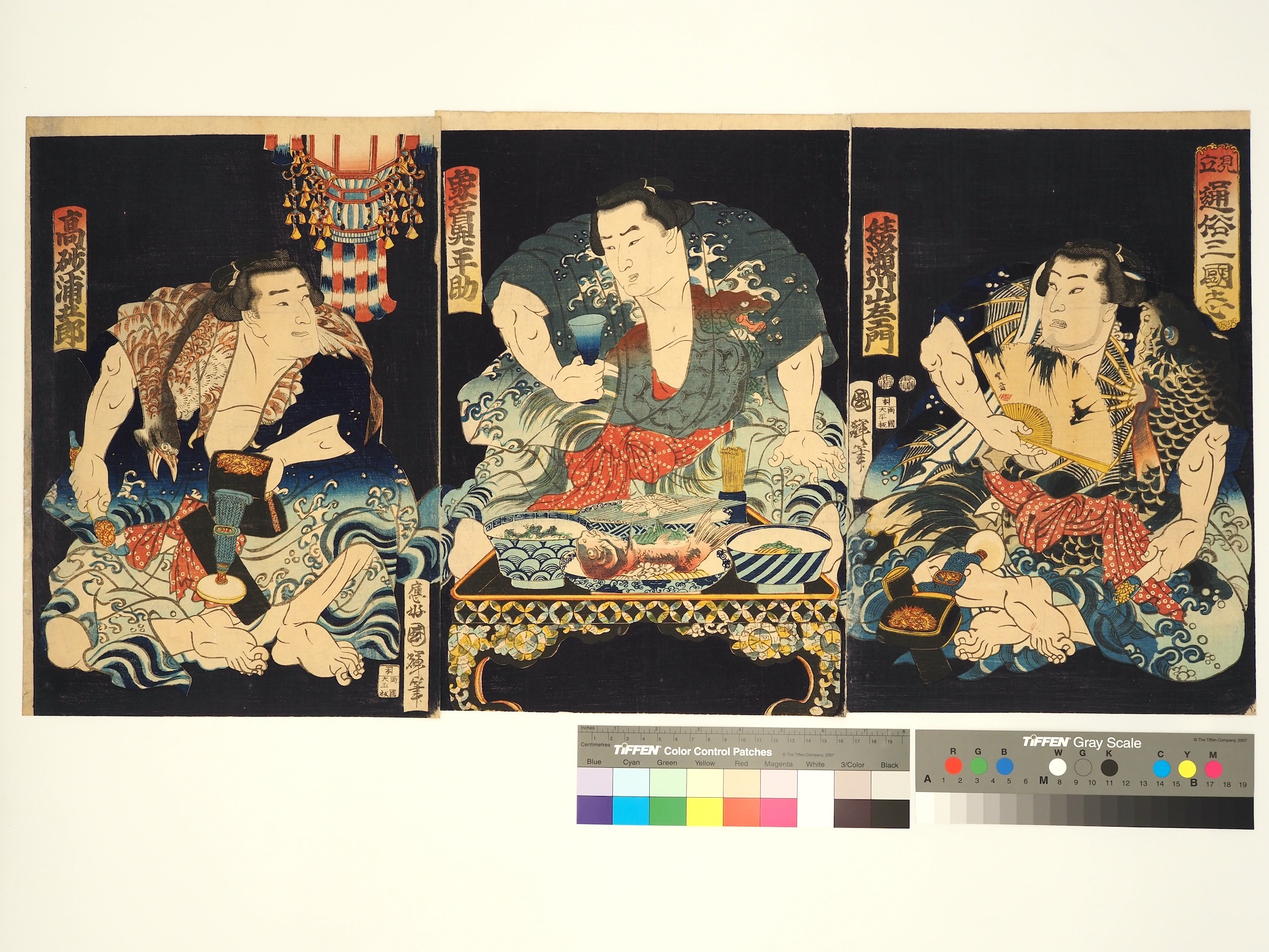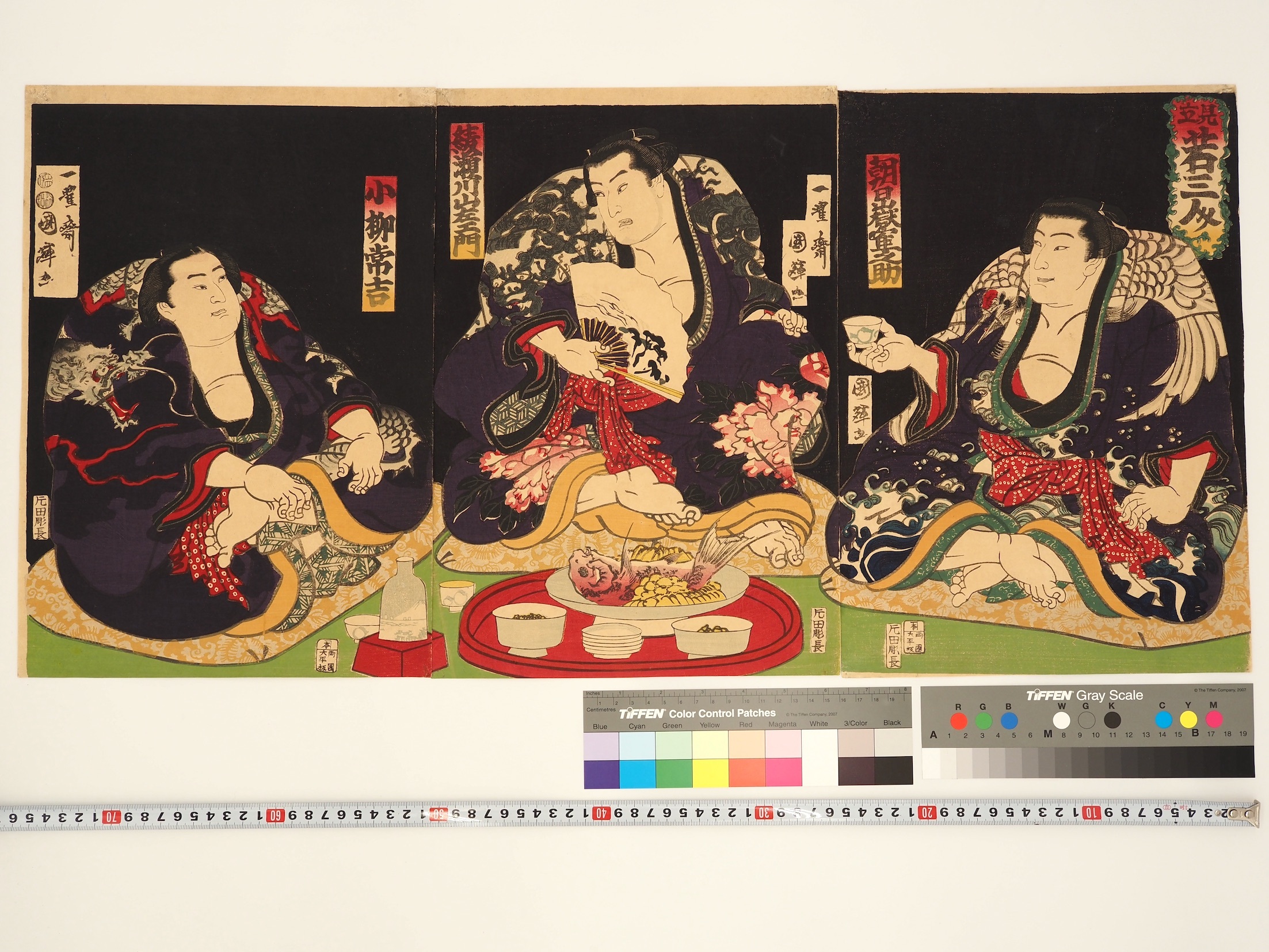 タイトル「見立若三人(小柳、綾瀬川、朝日嶽)」 タイトル「見立若三人(小柳、綾瀬川、朝日嶽)」 GSP-8D/歌川 国輝/見立若三人(小柳、綾瀬川、朝日嶽)/大黒屋(松木)平吉/明治6年頃/A/O/3枚続