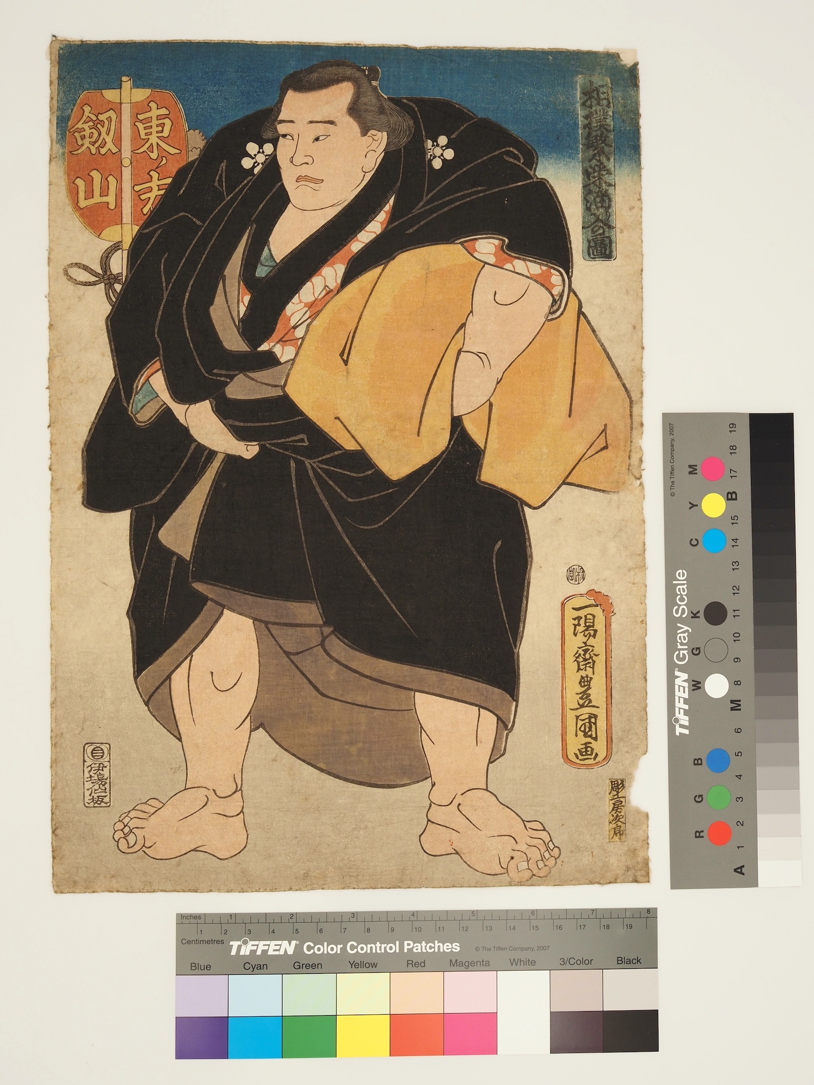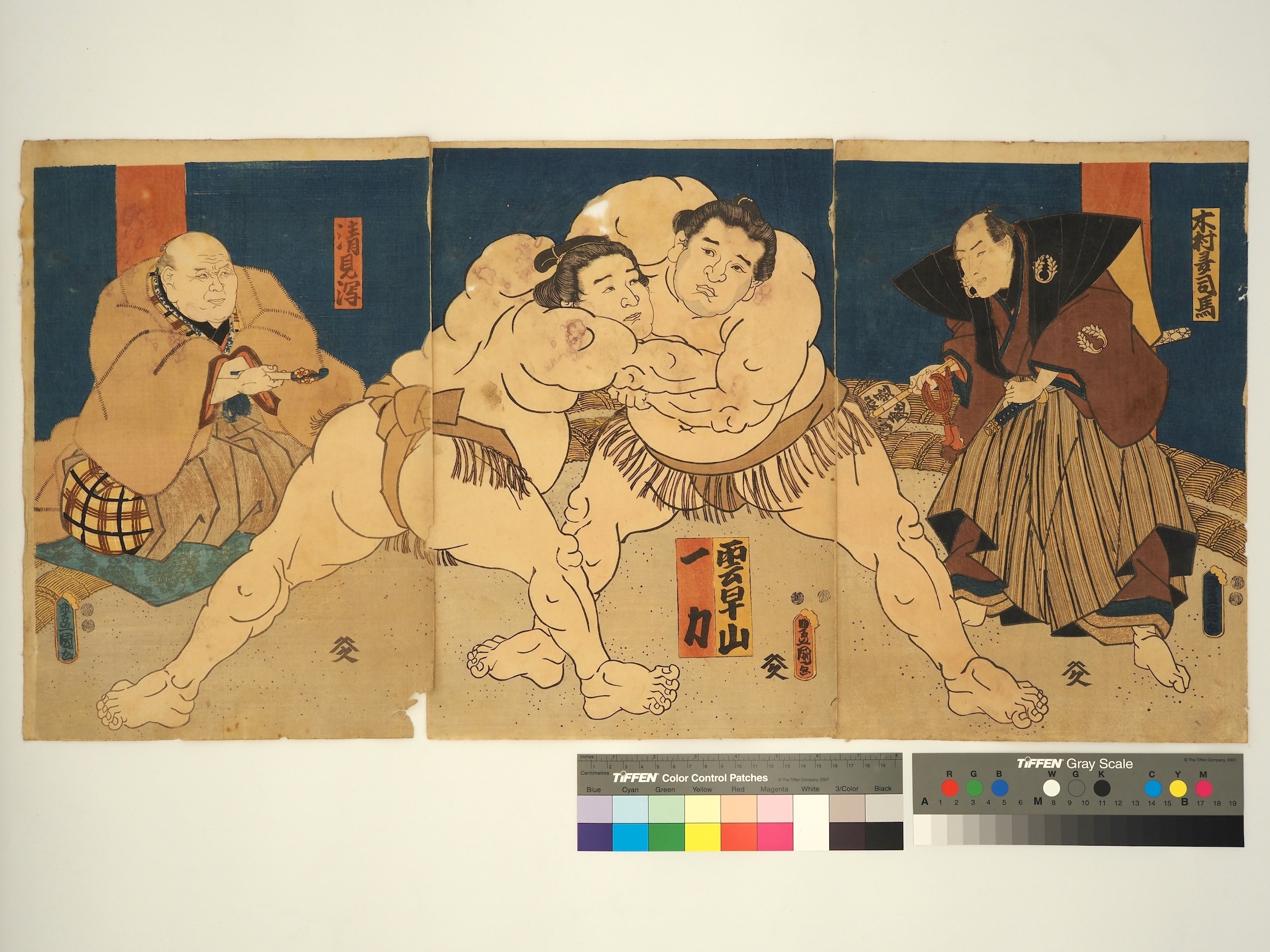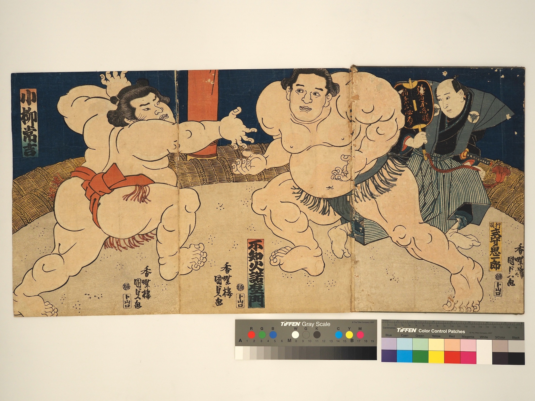 タイトル「(不知火諾右衛門と小柳常吉の取組図)」 タイトル「(不知火諾右衛門と小柳常吉の取組図)」 GSP-6A/歌川 国貞(初代)/豊国(三代)/(不知火諾右衛門と小柳常吉の取組図)/山口屋藤兵衛/天保11〜14年頃/A/O/3枚続