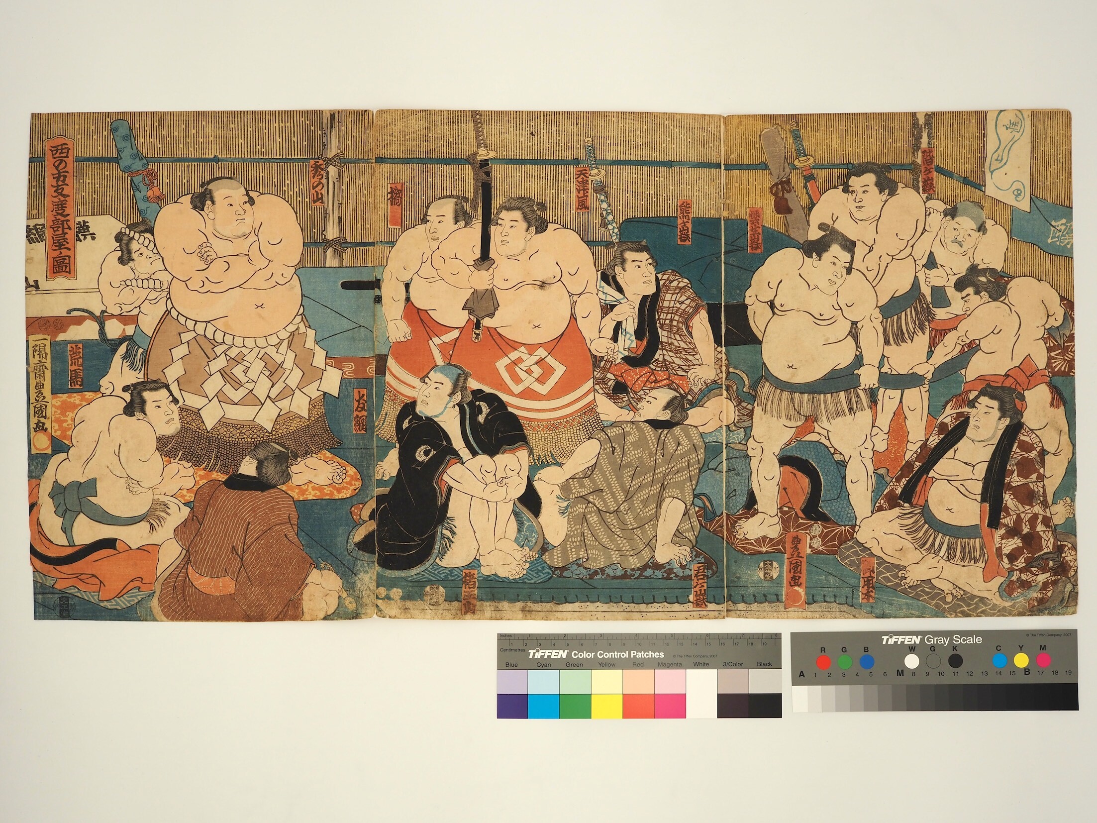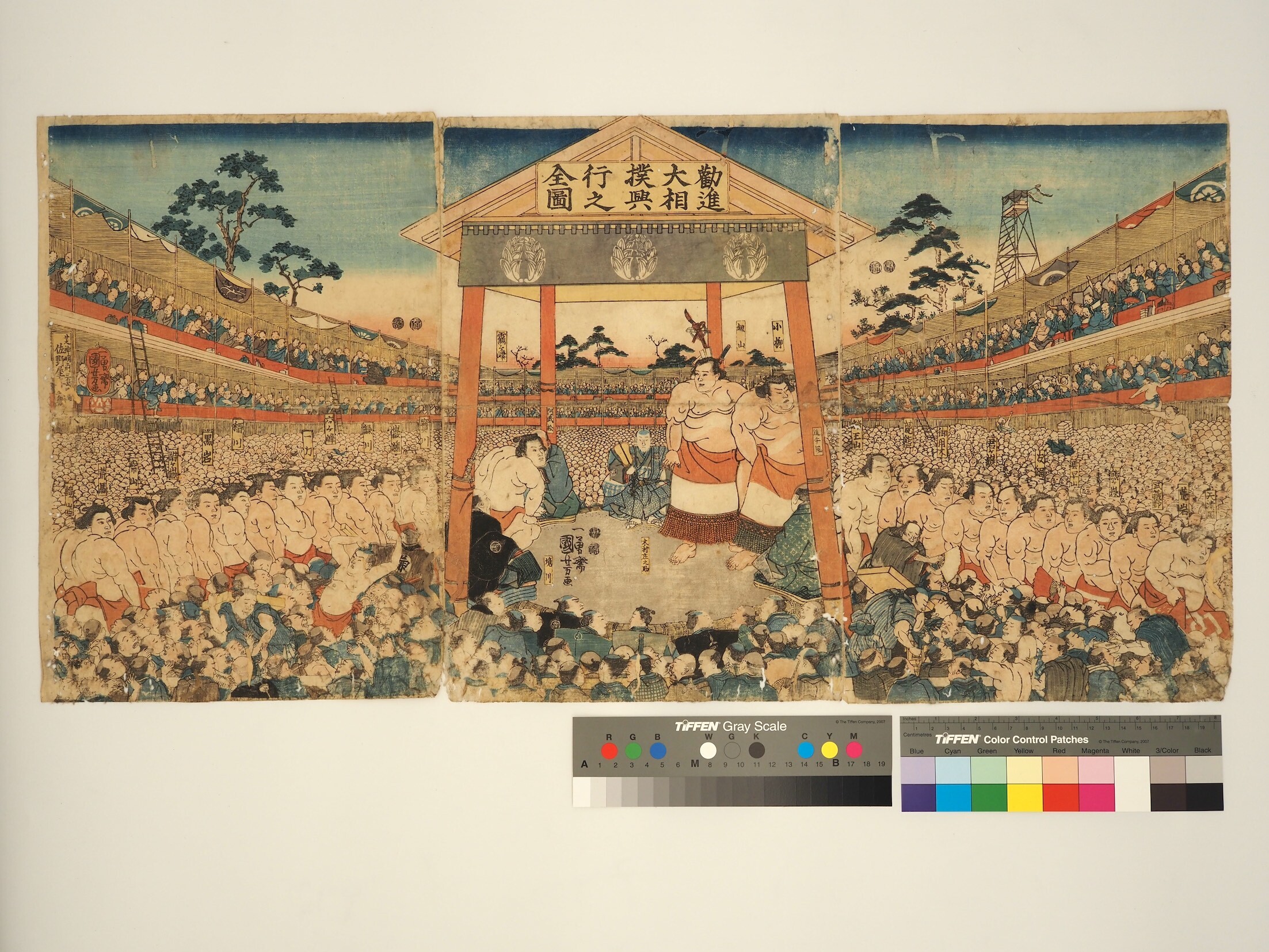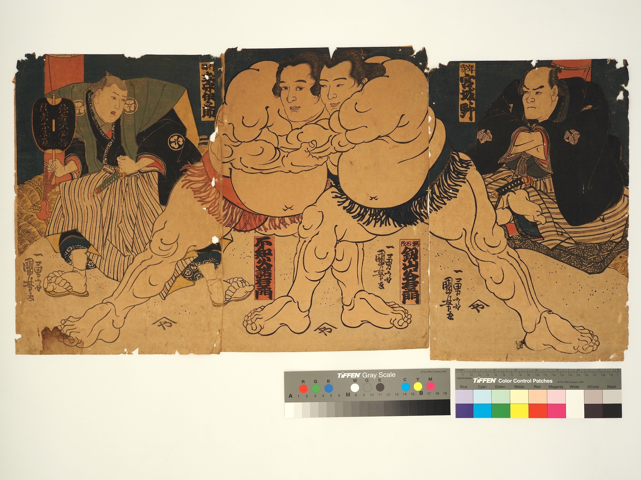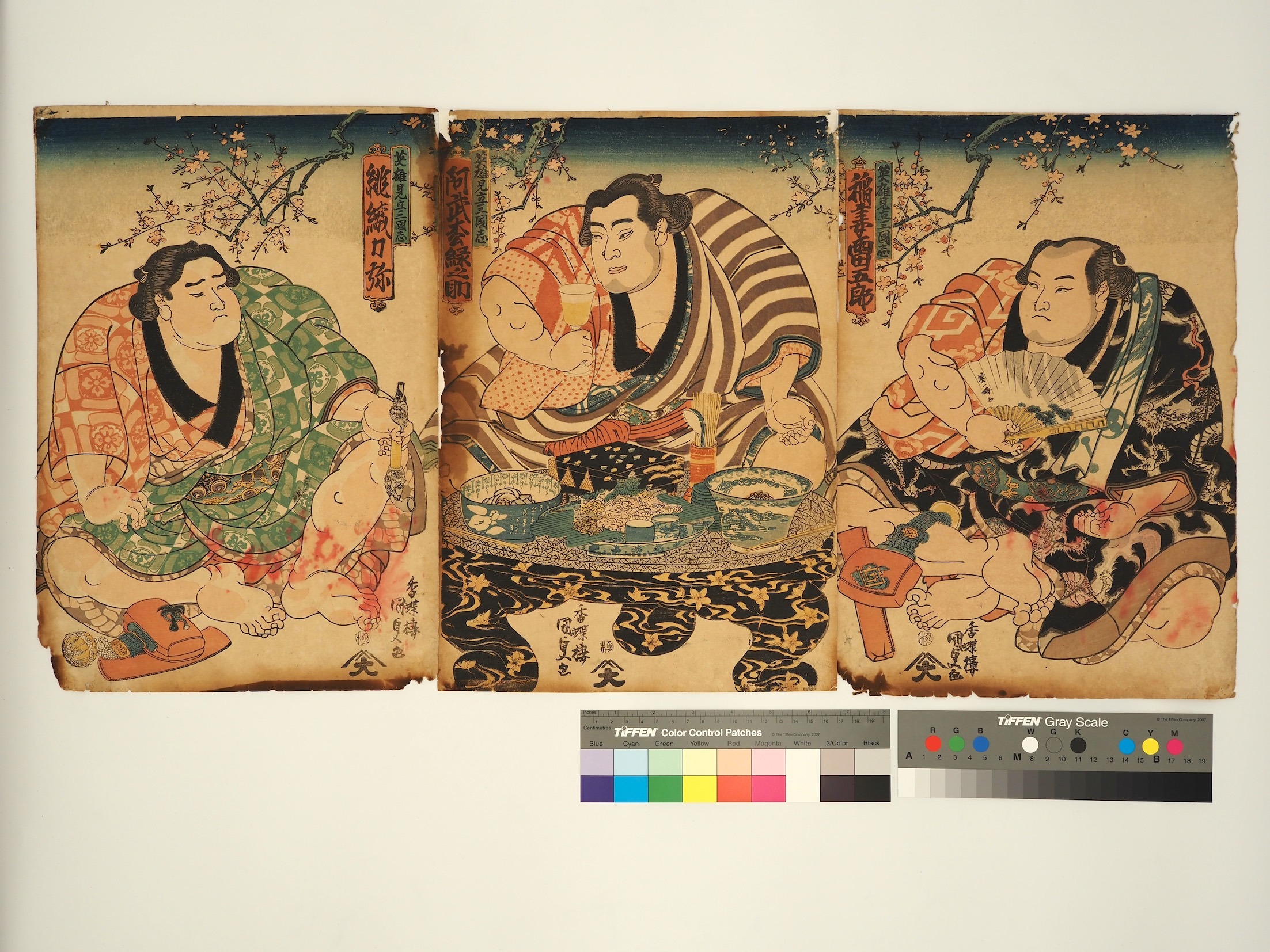 タイトル「英雄見立三國志(稲妻、阿武松、緋威)」 タイトル「英雄見立三國志(稲妻、阿武松、緋威)」 GSP-8A/歌川 国貞(初代)/豊国(三代)/英雄見立三國志(稲妻、阿武松、緋威)/上州屋金蔵/天保4〜6年頃/A/O/3枚続