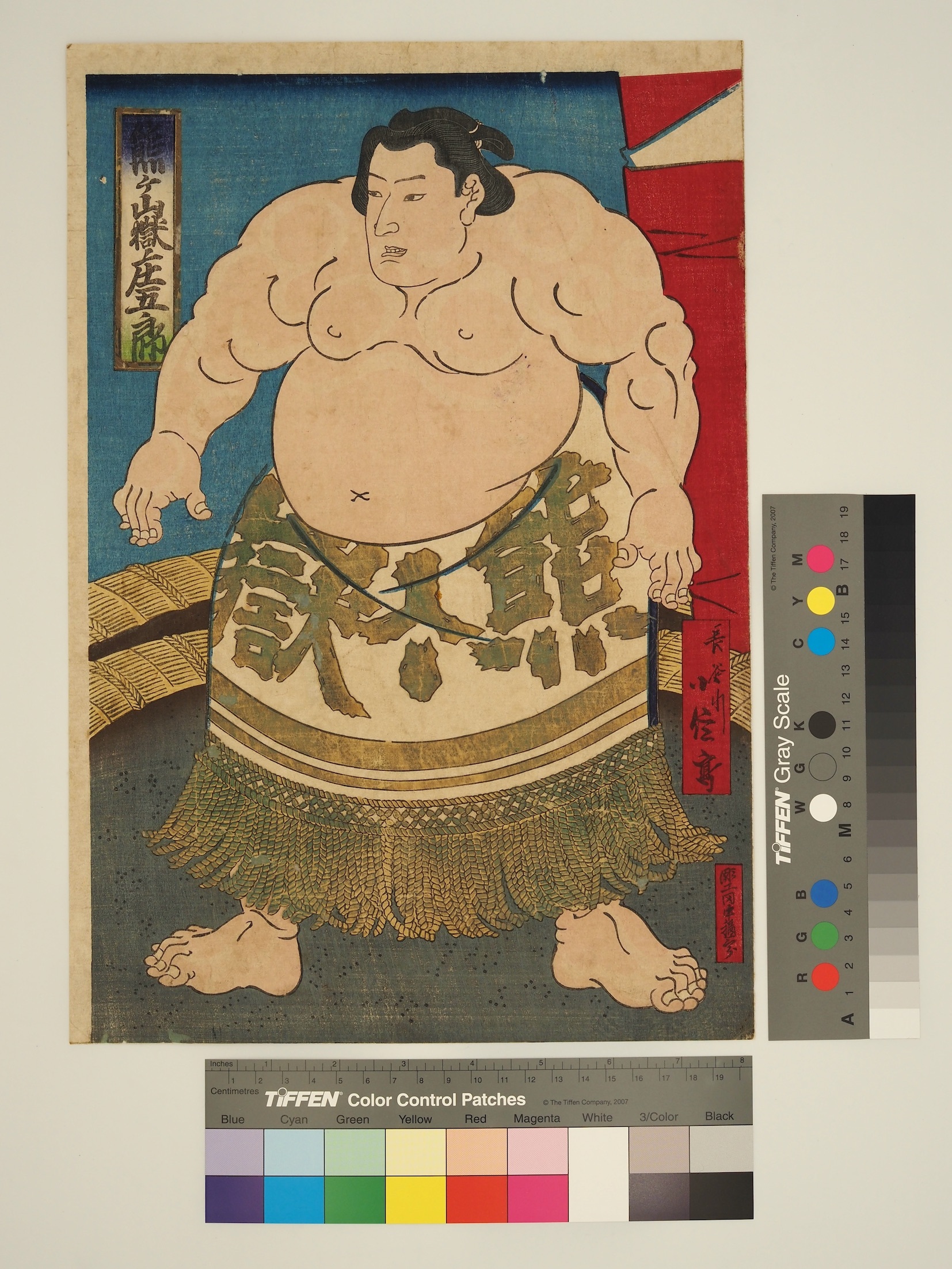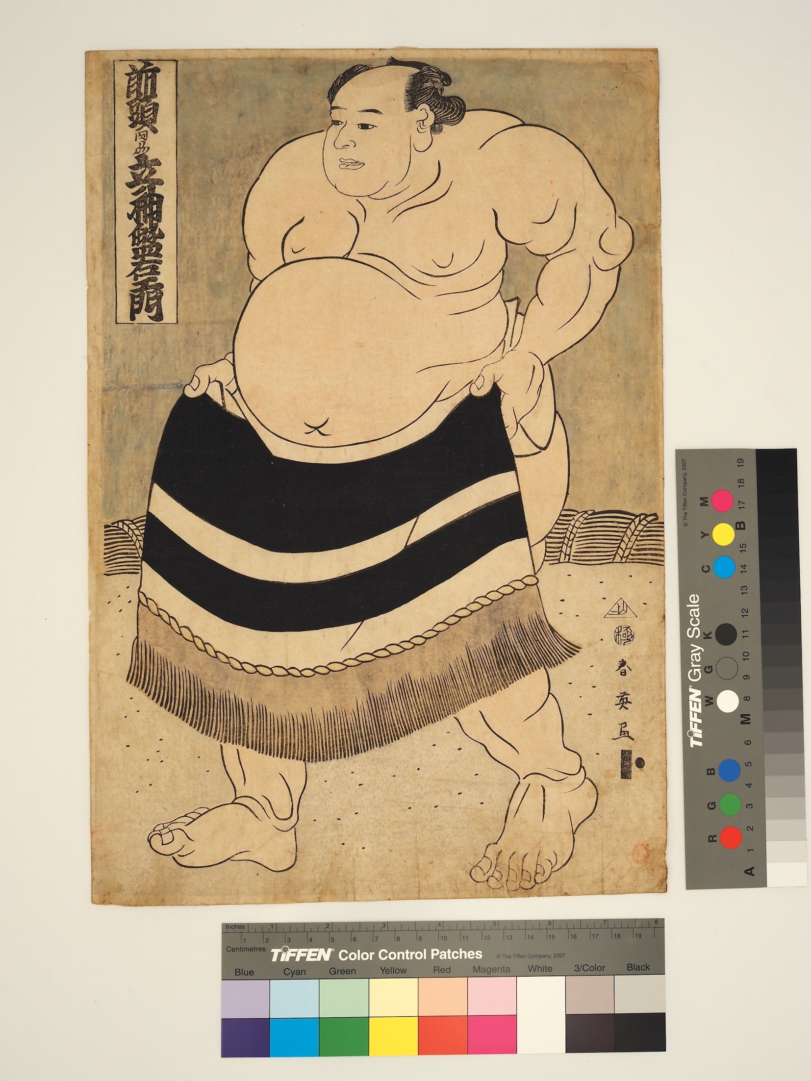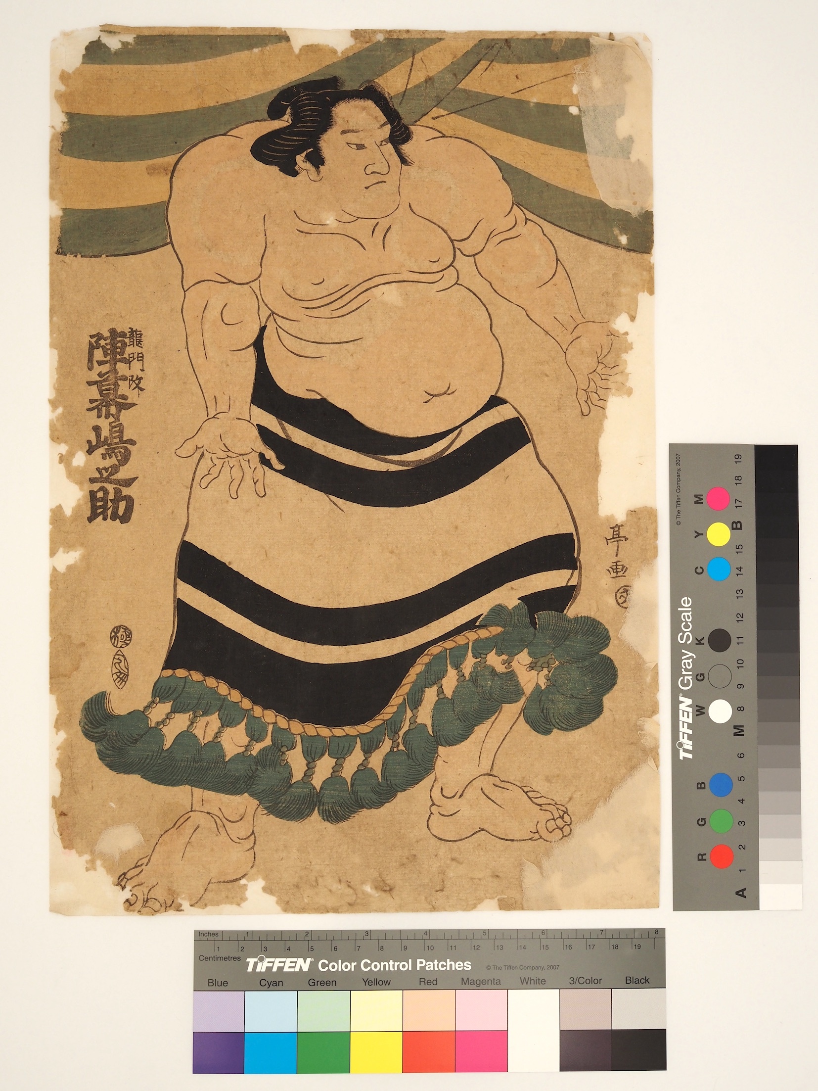 タイトル「⿓⾨改め陣幕嶋之助(姫路藩化粧廻)」 タイトル「⿓⾨改め陣幕嶋之助(姫路藩化粧廻)」 GSP-4D-1/勝川 春亭/⿓⾨改め陣幕嶋之助(姫路藩化粧廻)/丸屋⽂右衛⾨/⽂政5年/A/O/徳島藩抱ではない時代(⾼砂出⾝、姫路藩抱)