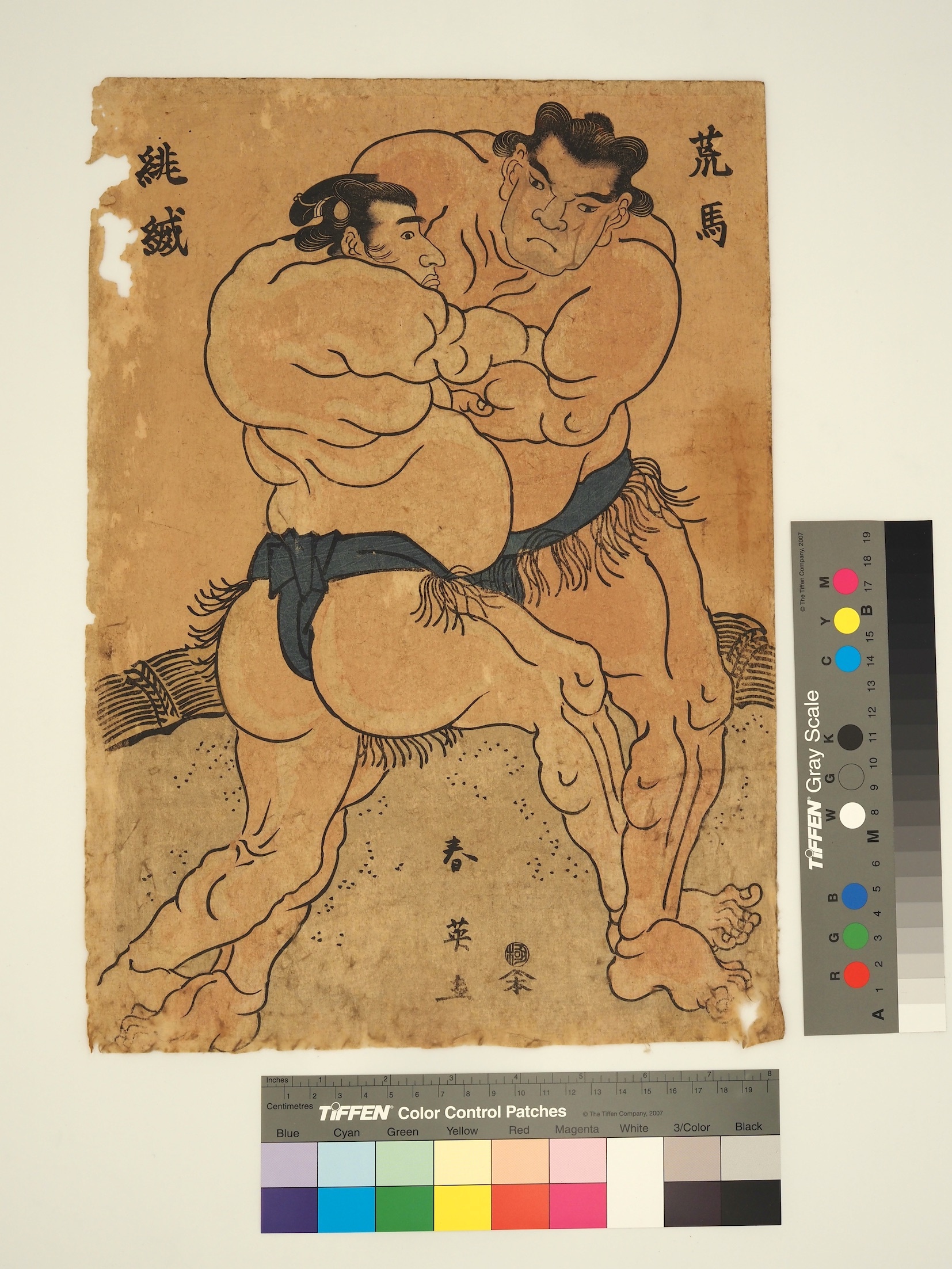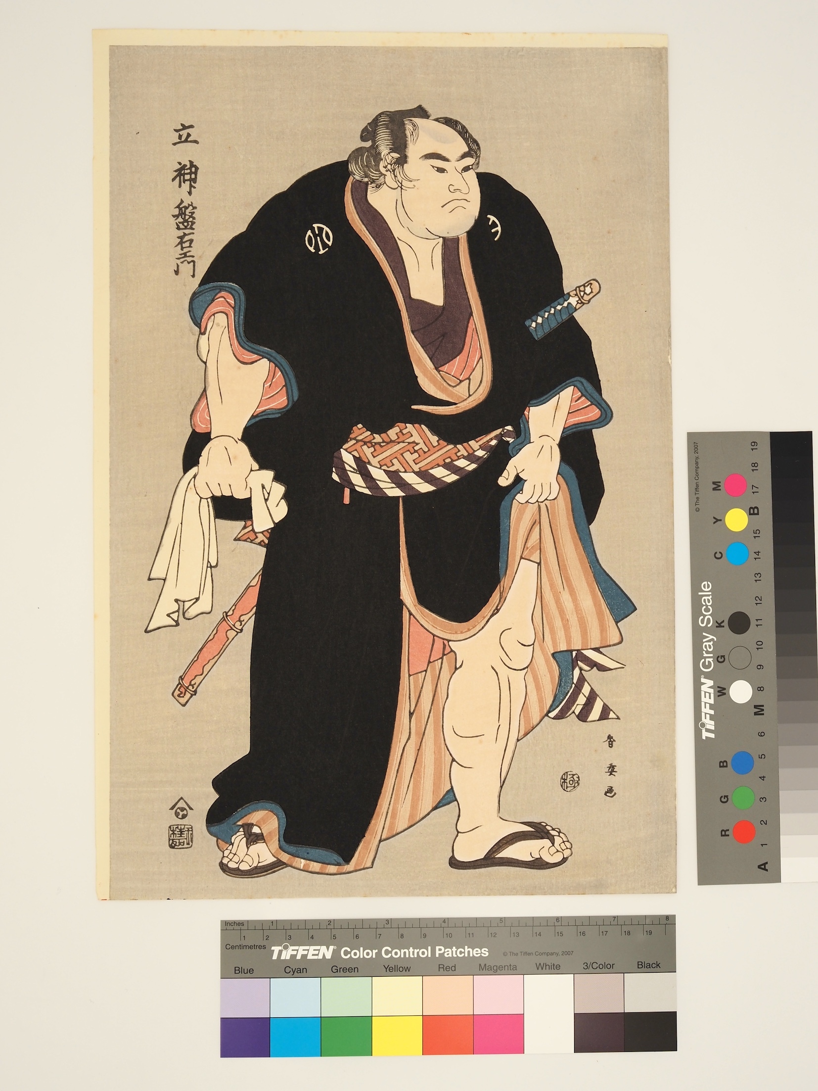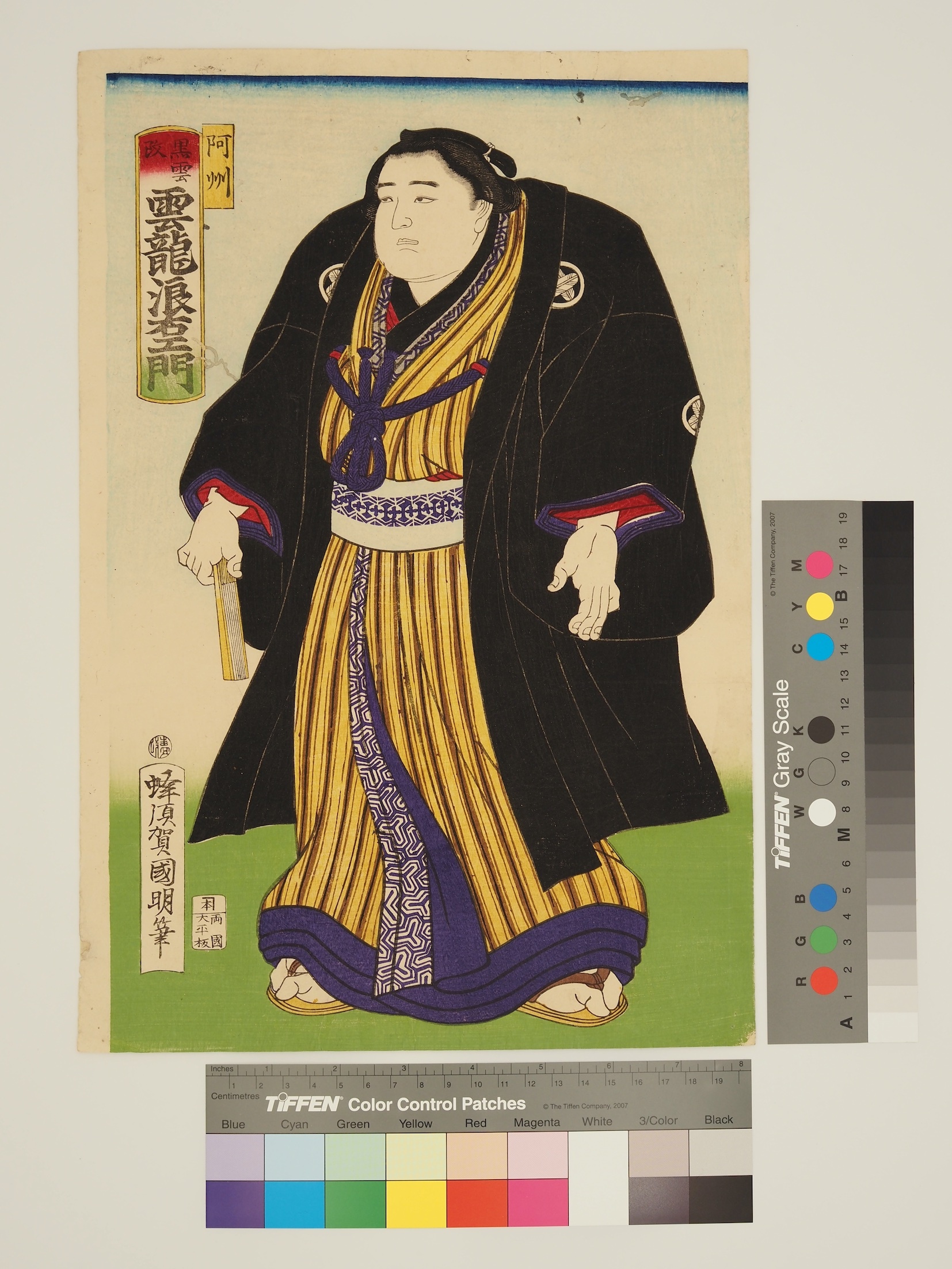 タイトル「⿓⾨改め陣幕嶋之助(姫路藩化粧廻)」 タイトル「⿓⾨改め陣幕嶋之助(姫路藩化粧廻)」 GSP-4D-1/勝川 春亭/⿓⾨改め陣幕嶋之助(姫路藩化粧廻)/丸屋⽂右衛⾨/⽂政5年/A/O/徳島藩抱ではない時代(⾼砂出⾝、姫路藩抱)