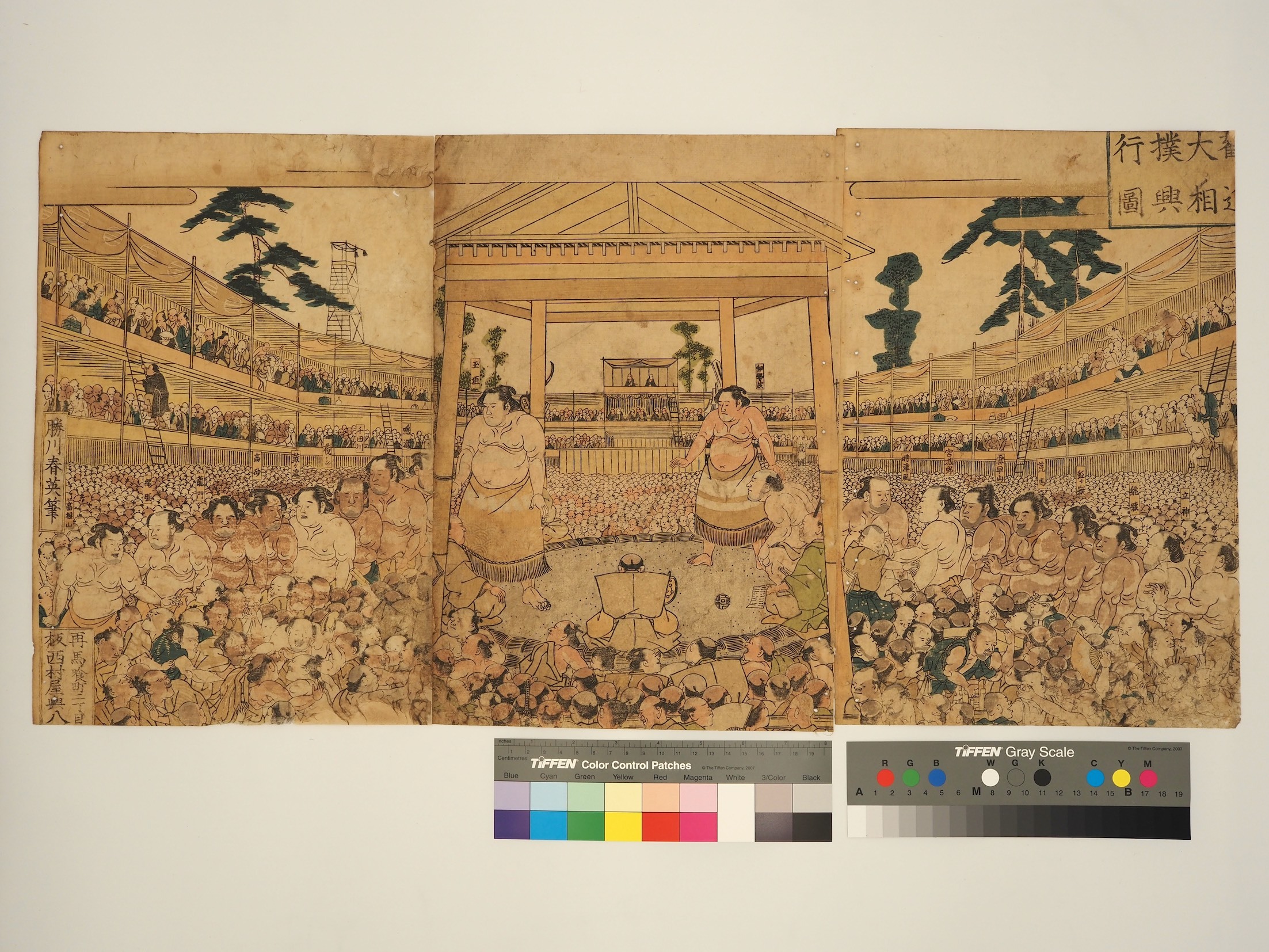 GSP-4A/勝川 春英/勧進⼤相撲興⾏圖/⻄村屋与⼋/⽂化14年/A/O/⽂化14年1⽉場所。⽴神盤右衛⾨、雲早⼭森之助。