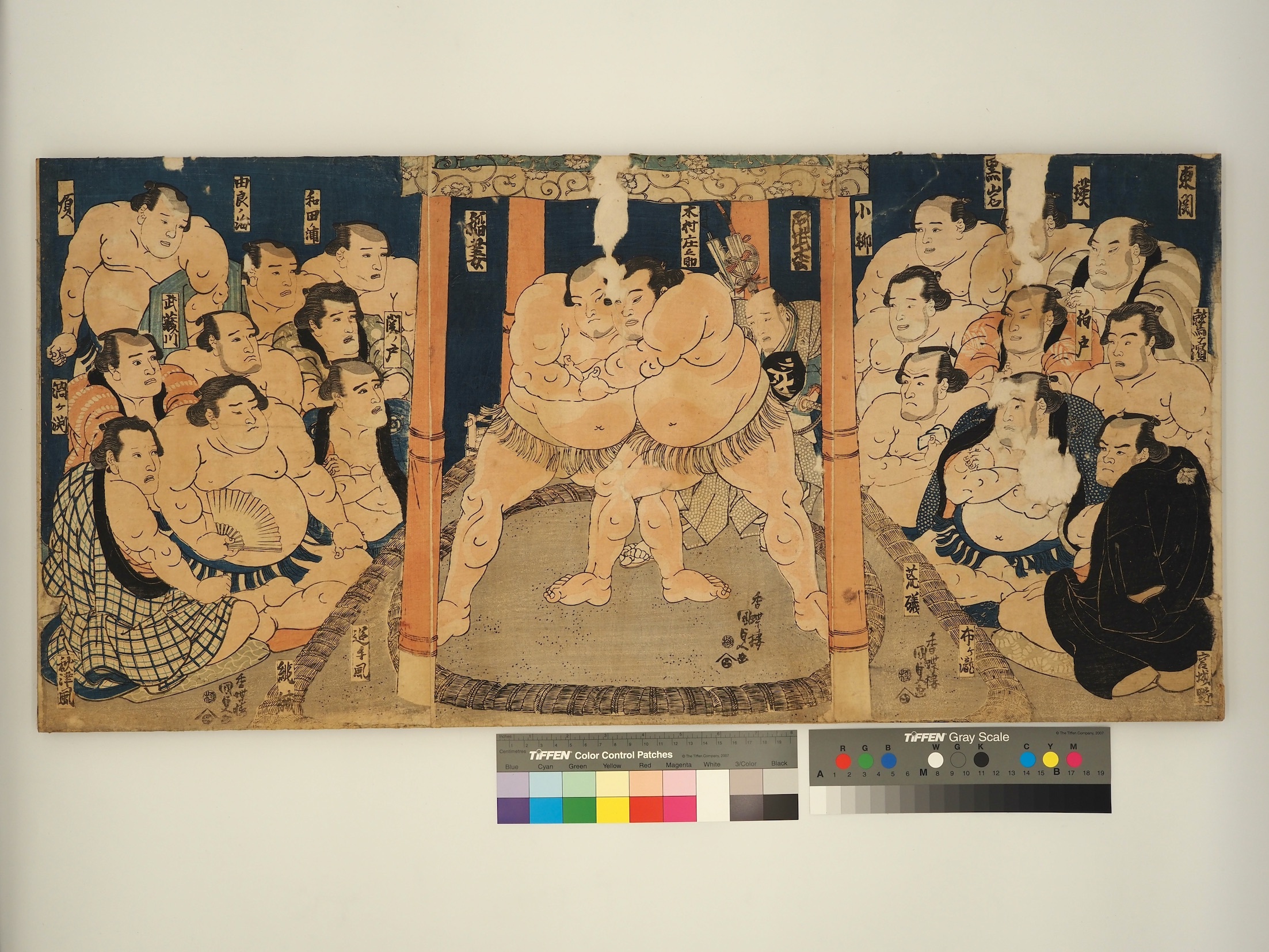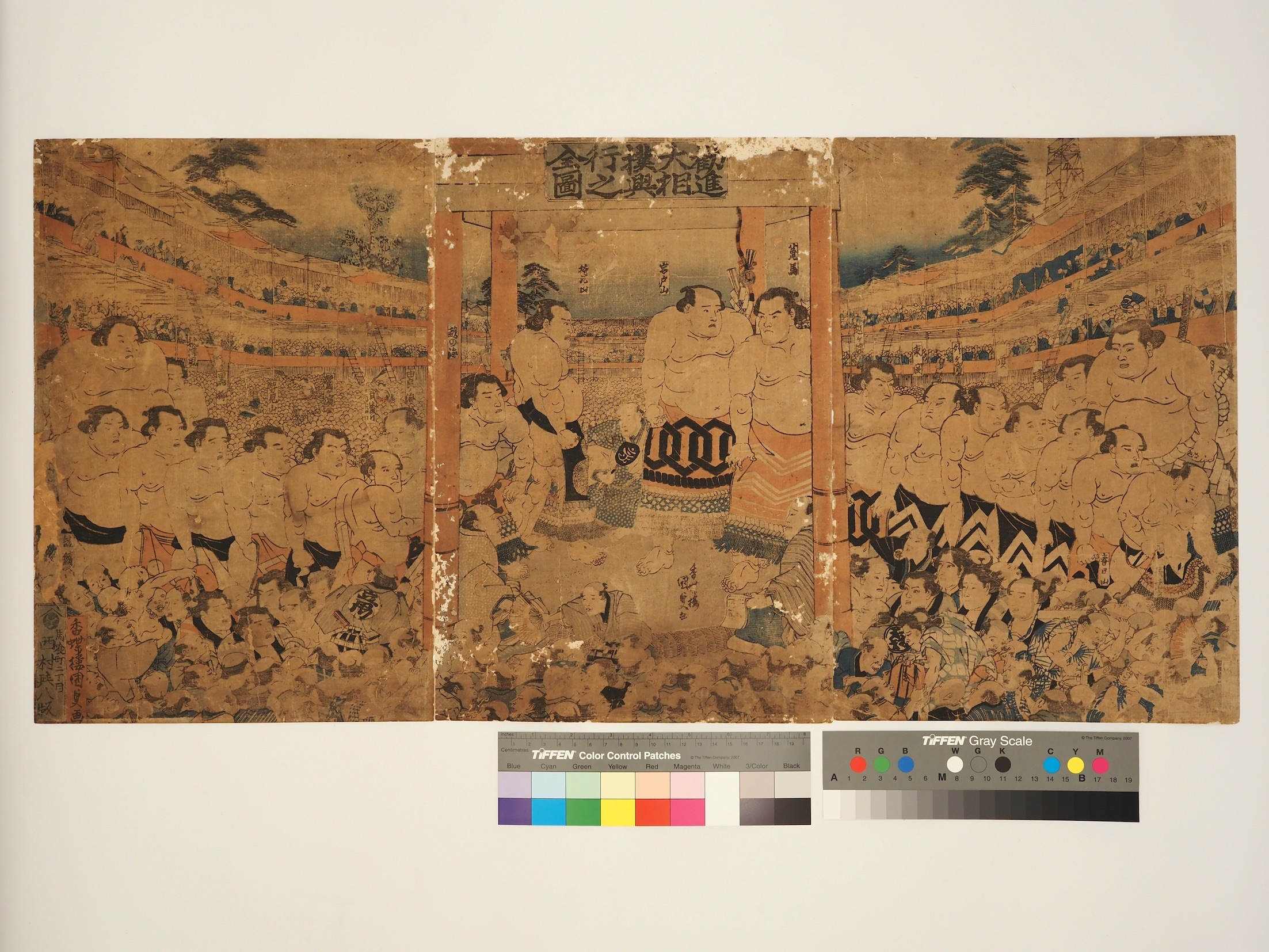 GSP-4C/歌川 国貞(初代)/豊国(三代)/勧進⼤相撲⼟俵⼊之全図/⻄村屋与⼋/⽂政11年/A/O/3枚続