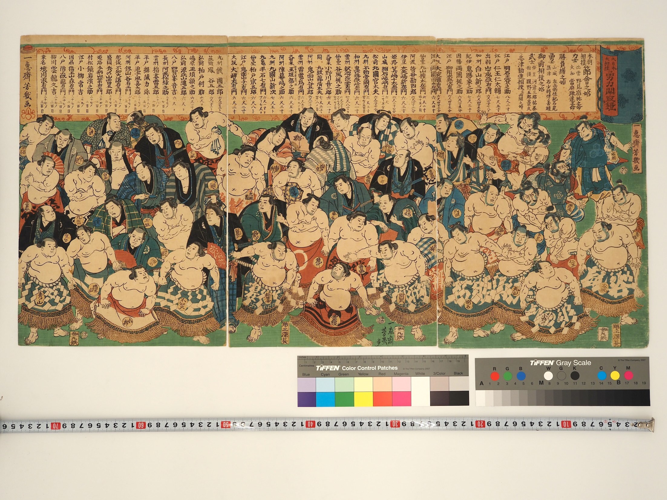 P7-1B/落合 芳幾/大日本大相撲勇力関取鏡/丸屋鉄治郎/安政5年頃/A/O/3枚続。