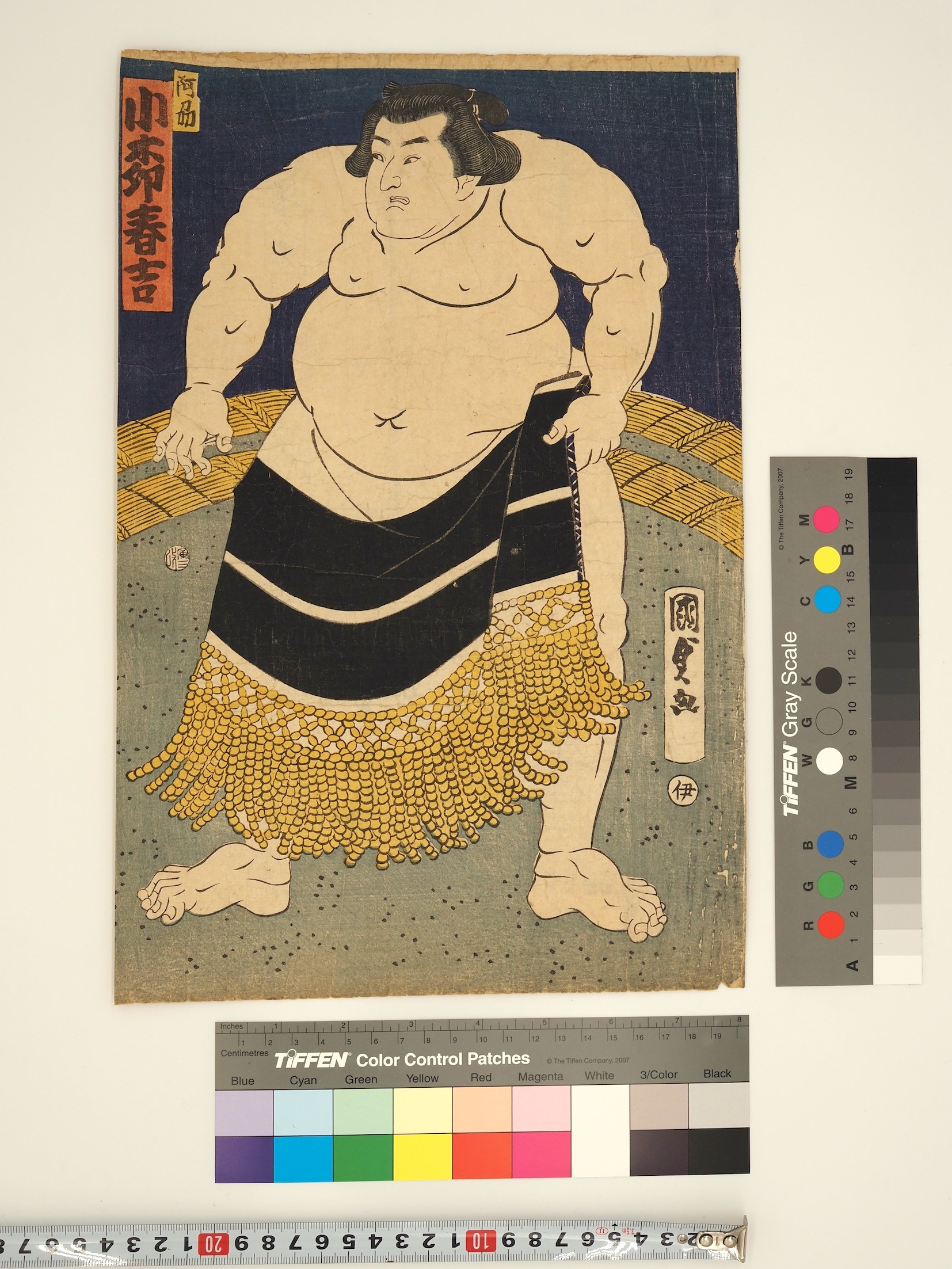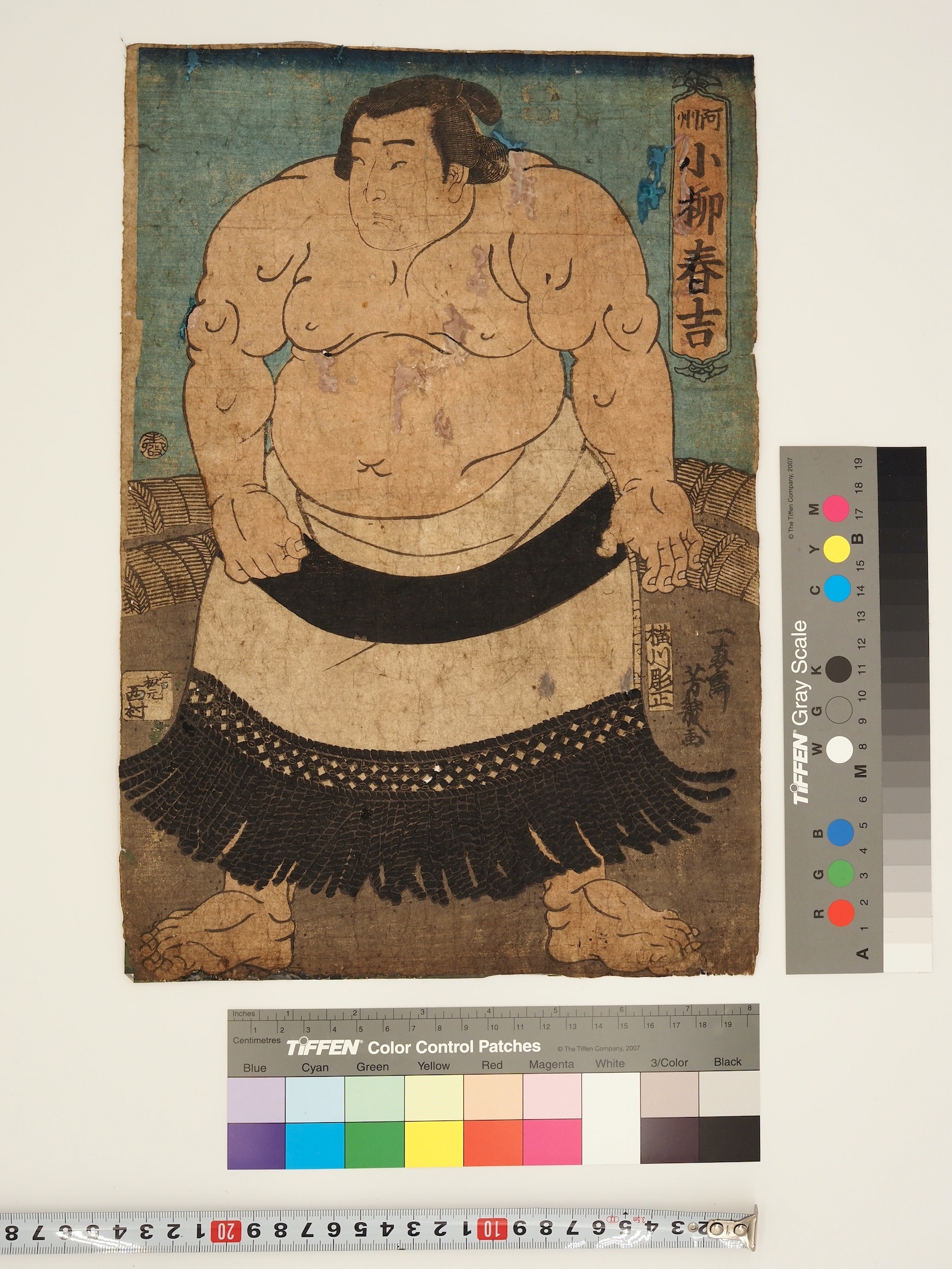 ※キャプションの説明:展示ID/絵師/画題/版元・制作/出版年/所蔵/版/備考 凡例 (所蔵) A, 阿波相撲史ワークス; D, 徳島県立文書館; K, 葛城市相撲館「けはや座」; P, 個人蔵; X, 公共アーカイブ等 凡例 (版) C, 複写/複製; O, 原図; R, 復刻