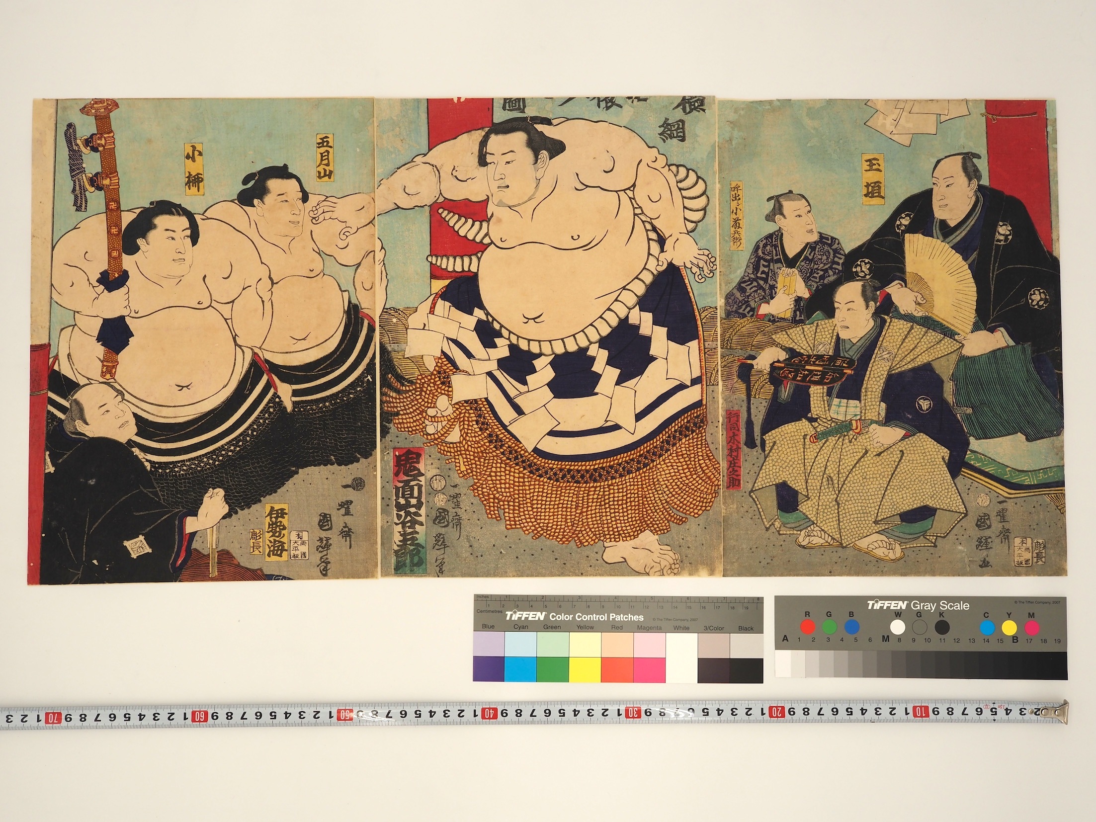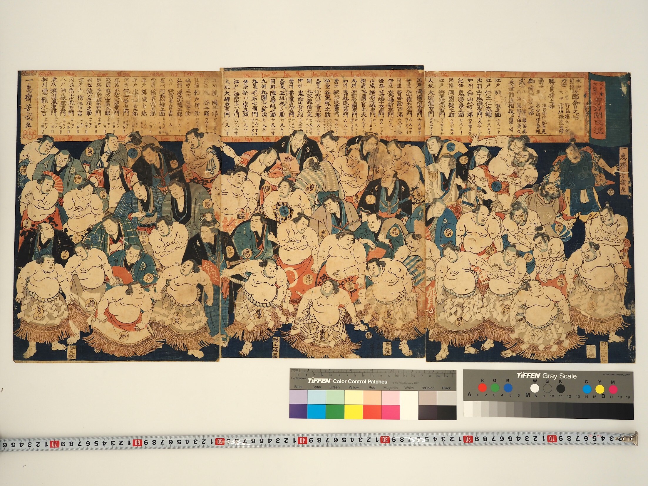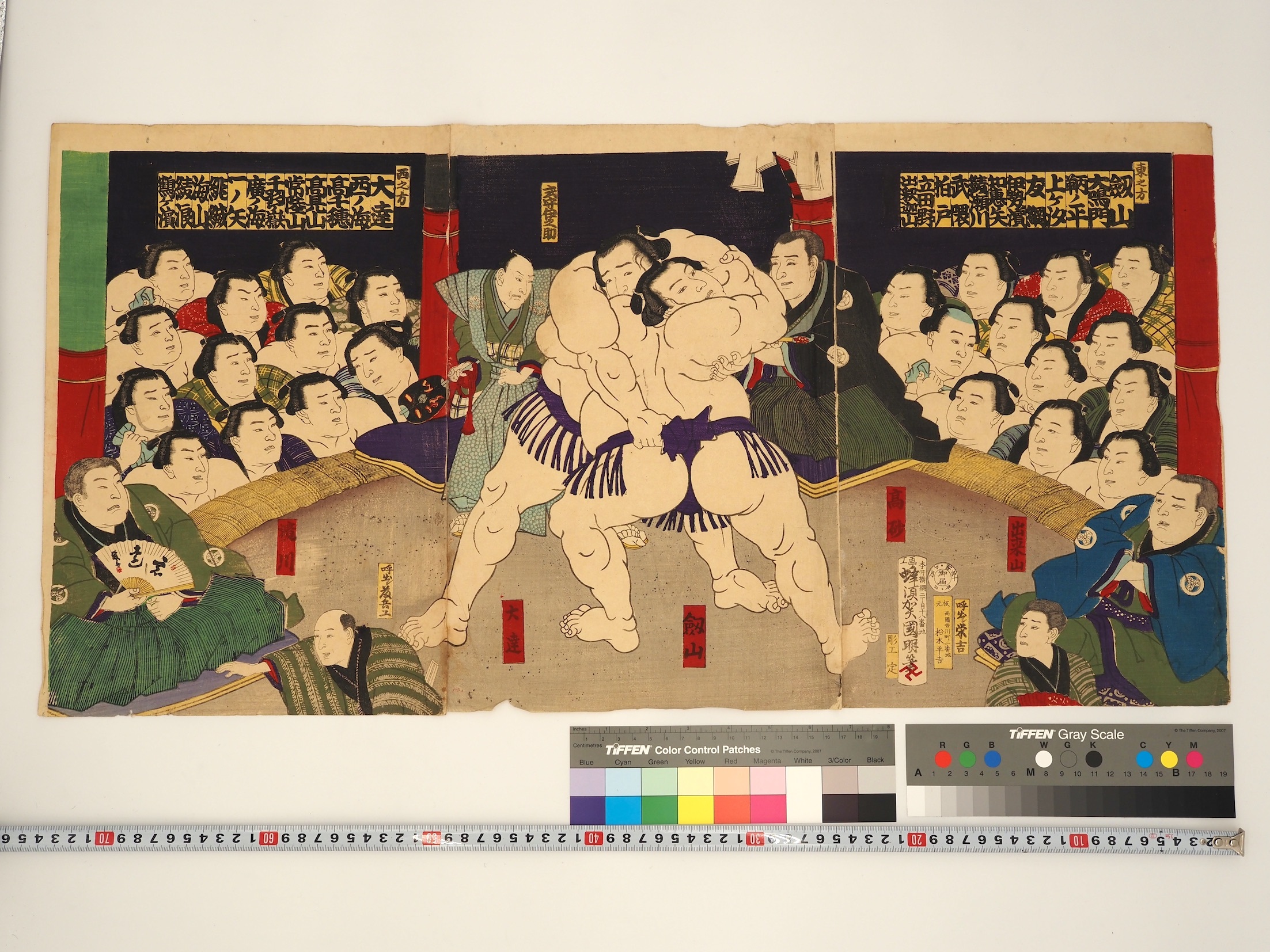 タイトル「(剣山と大達の取組図)」 タイトル「(剣山と大達の取組図)」 P3-3C/歌川(蜂須賀)国明/(剣山と大達の取組図)/大黒屋(松木)平吉/明治20年1月改版/A/O/3枚続、255の改版(番付は明治20年1月)