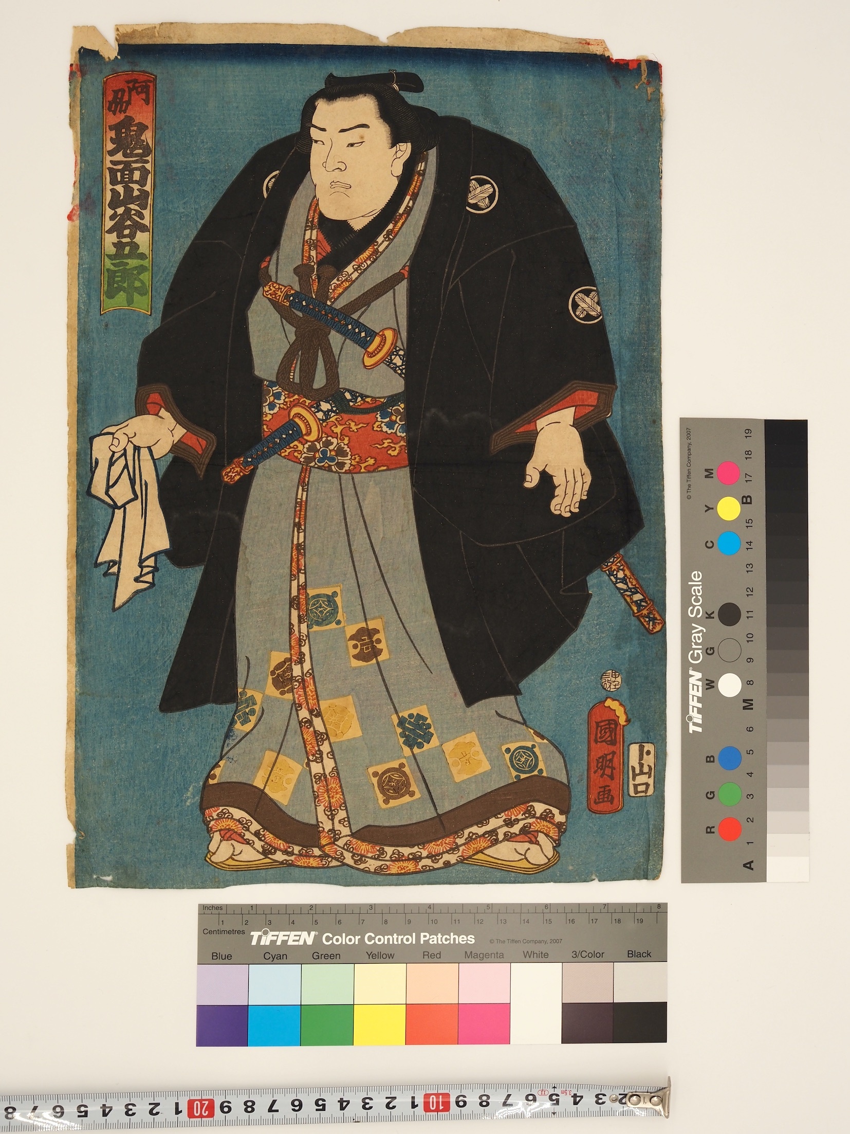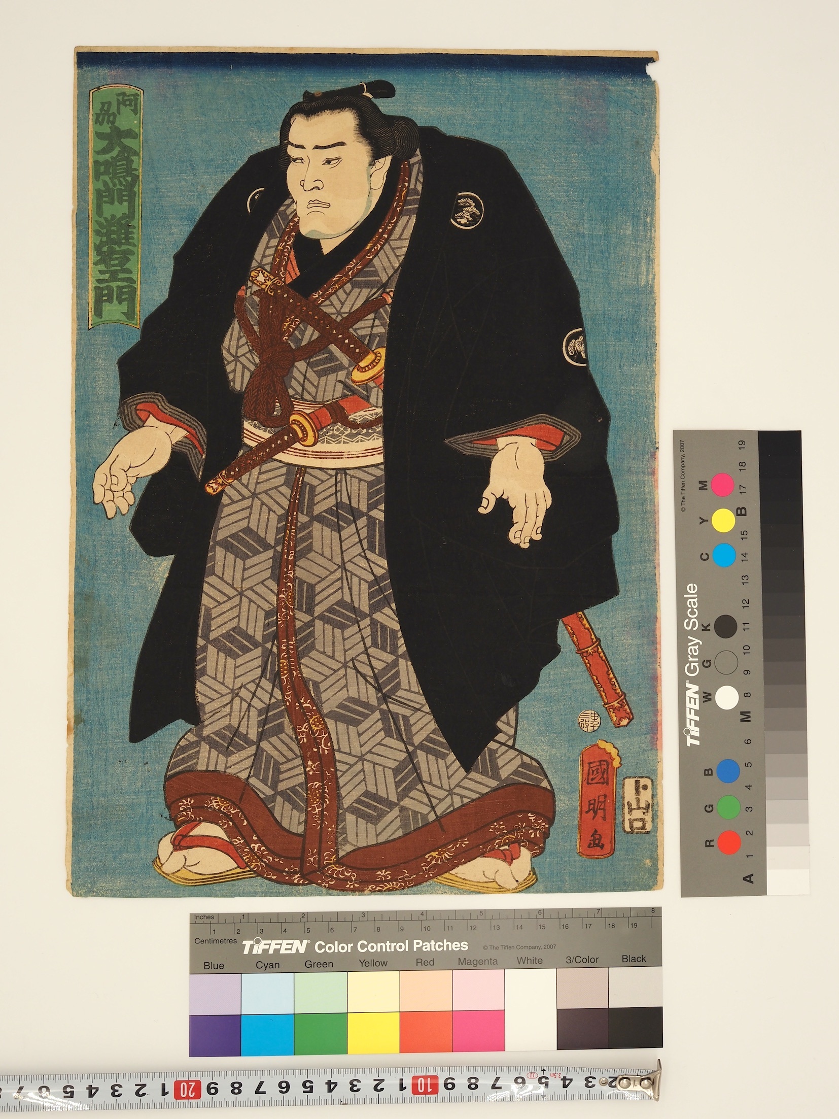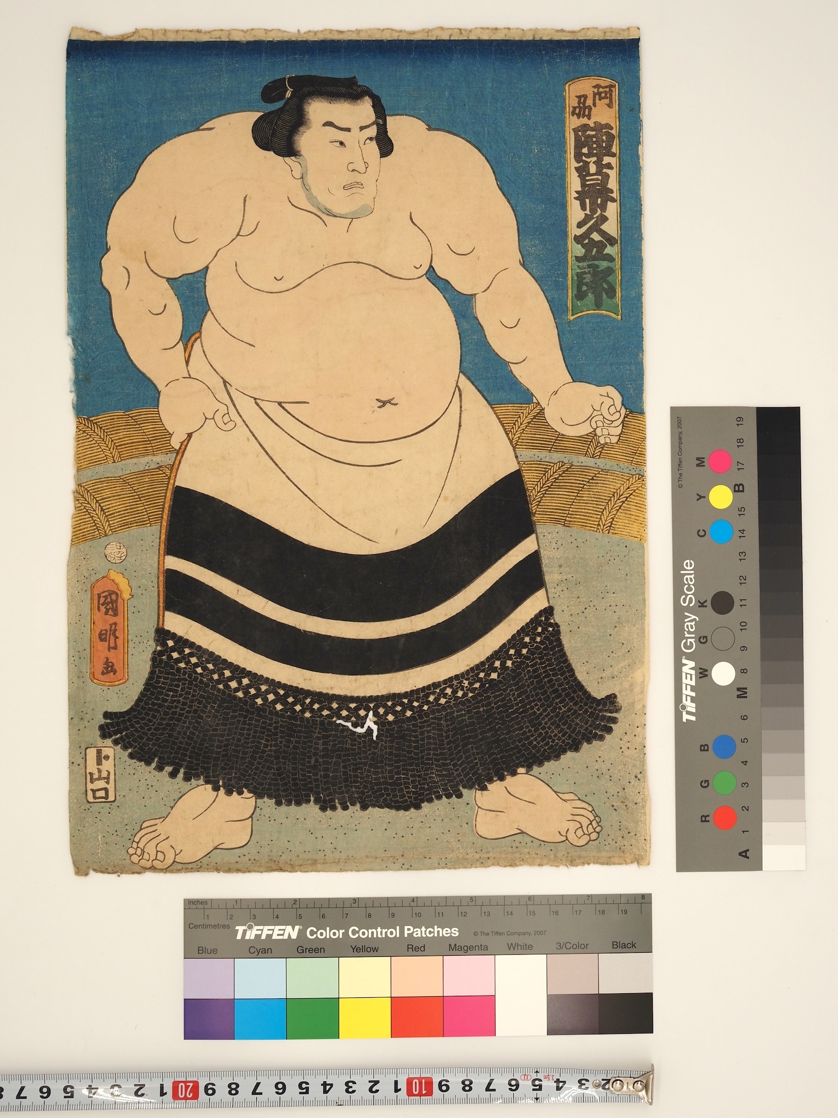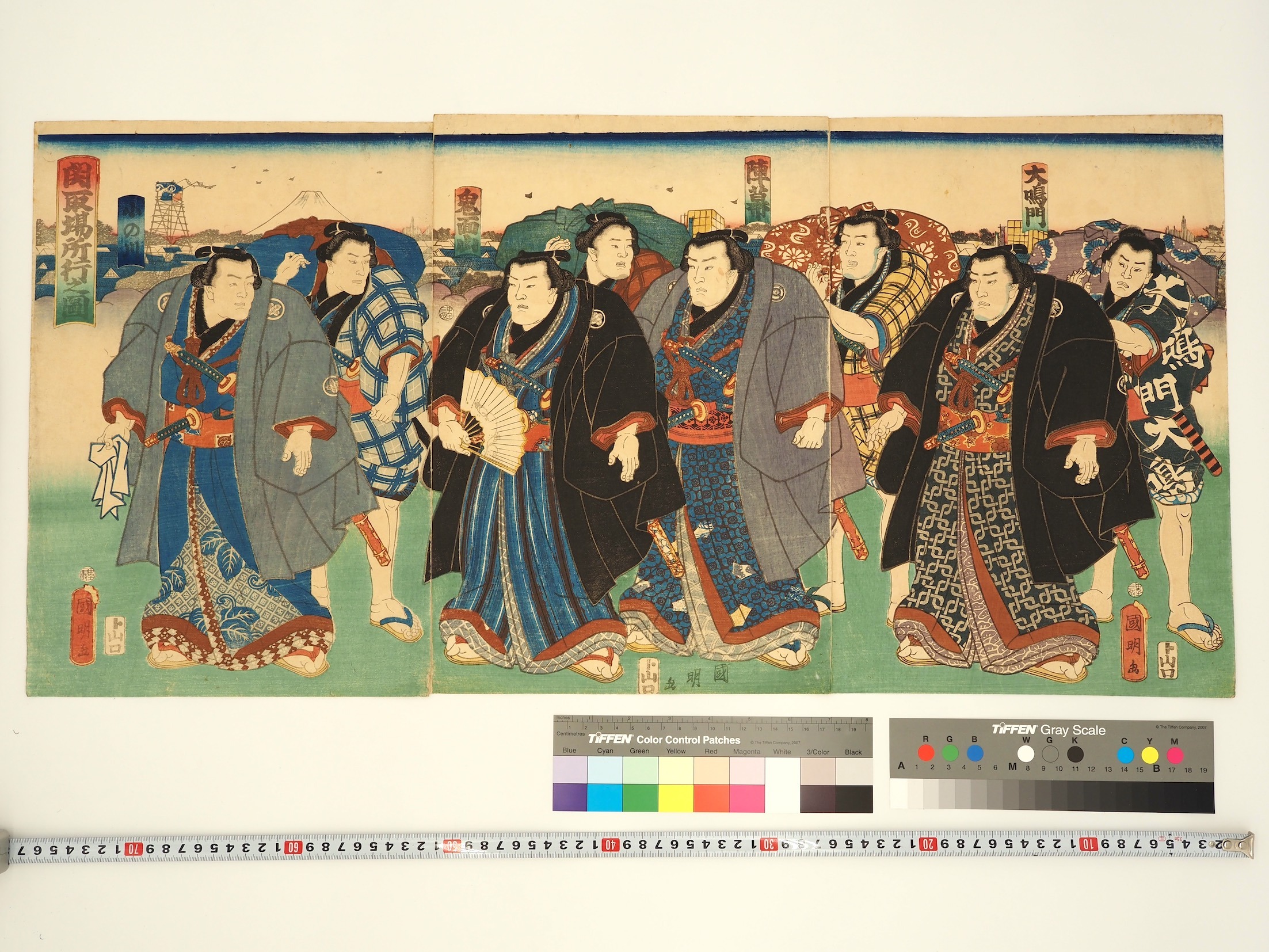 タイトル「(剣山と大達の取組図)」 タイトル「(剣山と大達の取組図)」 P3-3C/歌川(蜂須賀)国明/(剣山と大達の取組図)/大黒屋(松木)平吉/明治20年1月改版/A/O/3枚続、255の改版(番付は明治20年1月)