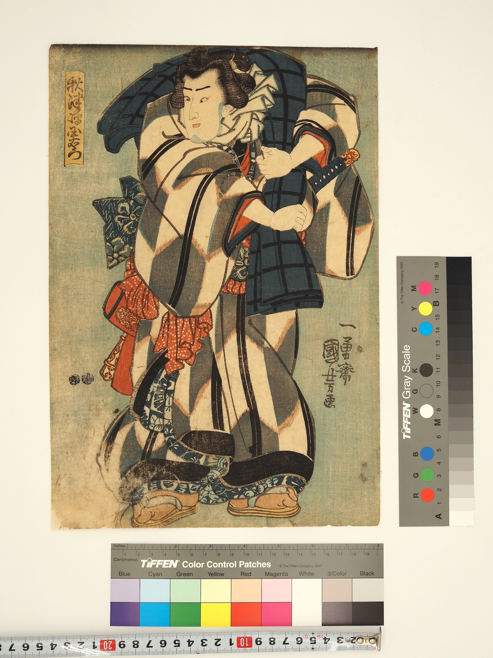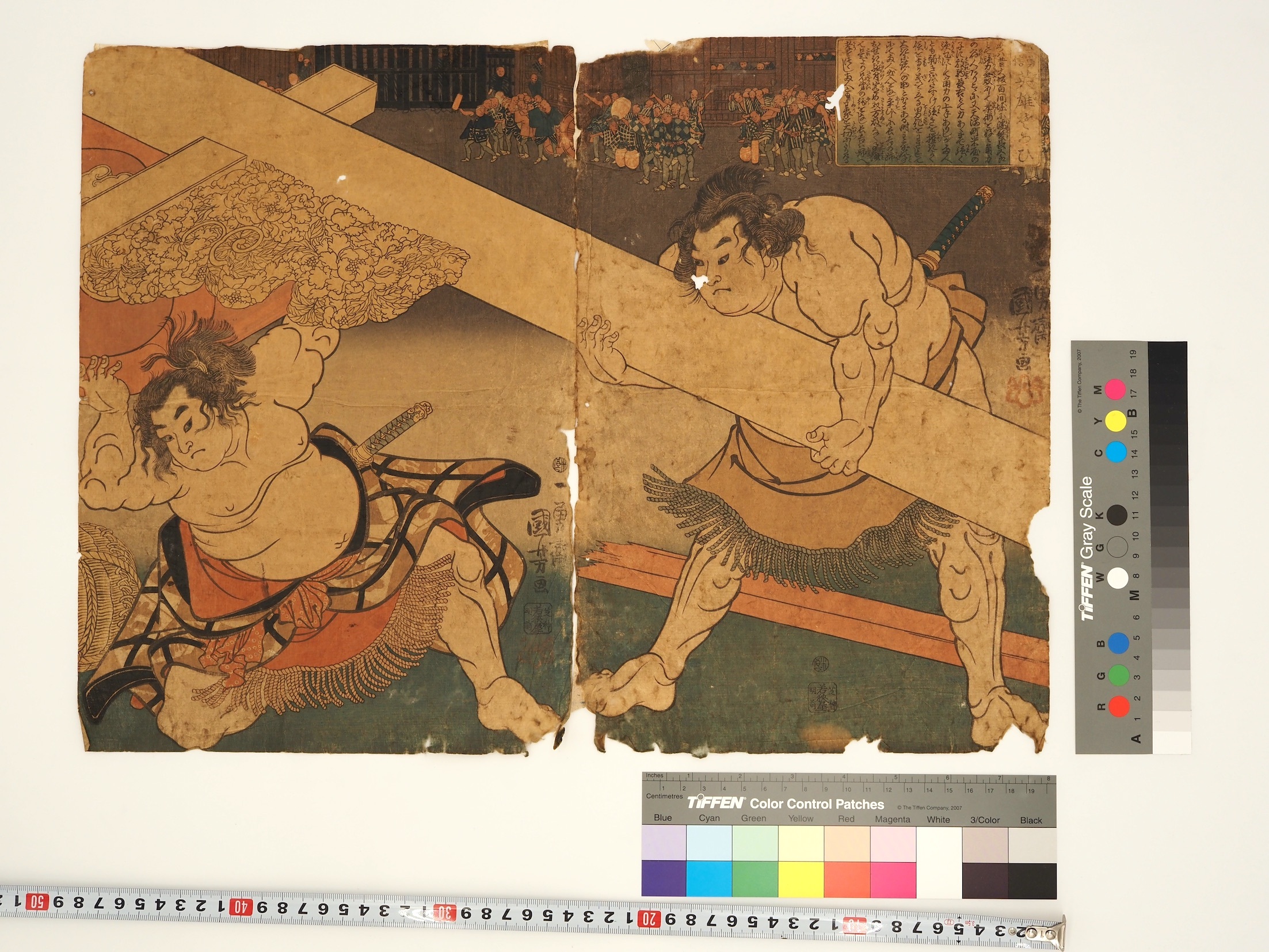 タイトル「義勇孝信英雄そろひ(放駒長吉と濡髪長五郎)」 タイトル「義勇孝信英雄そろひ(放駒長吉と濡髪長五郎)」 P5-3-3/歌川 国芳/義勇孝信英雄そろひ(放駒長吉と濡髪長五郎)/若狭屋与市/弘化年間/A/O/3枚続の2枚。ジョージ石黒氏著作のカバー絵。