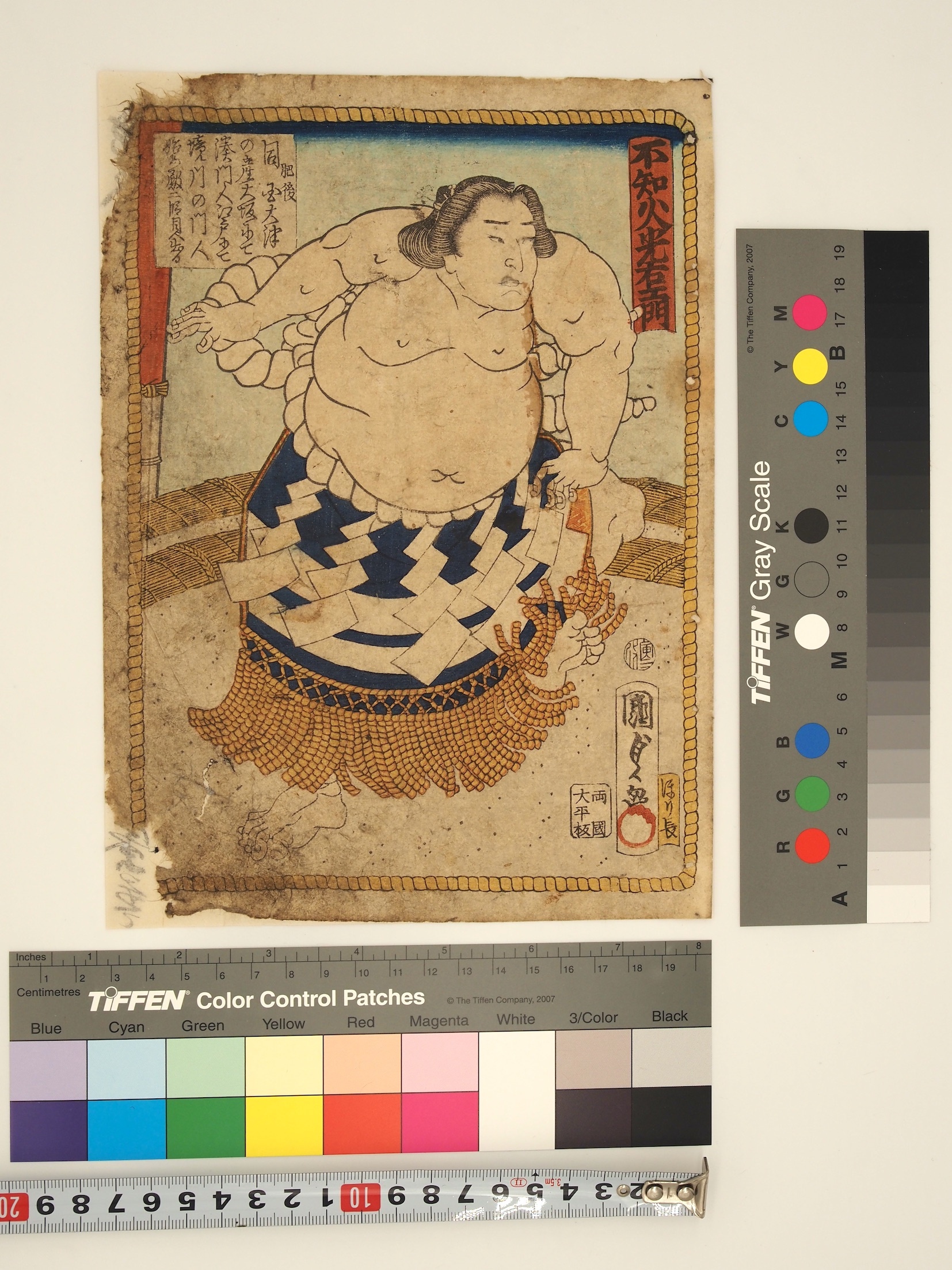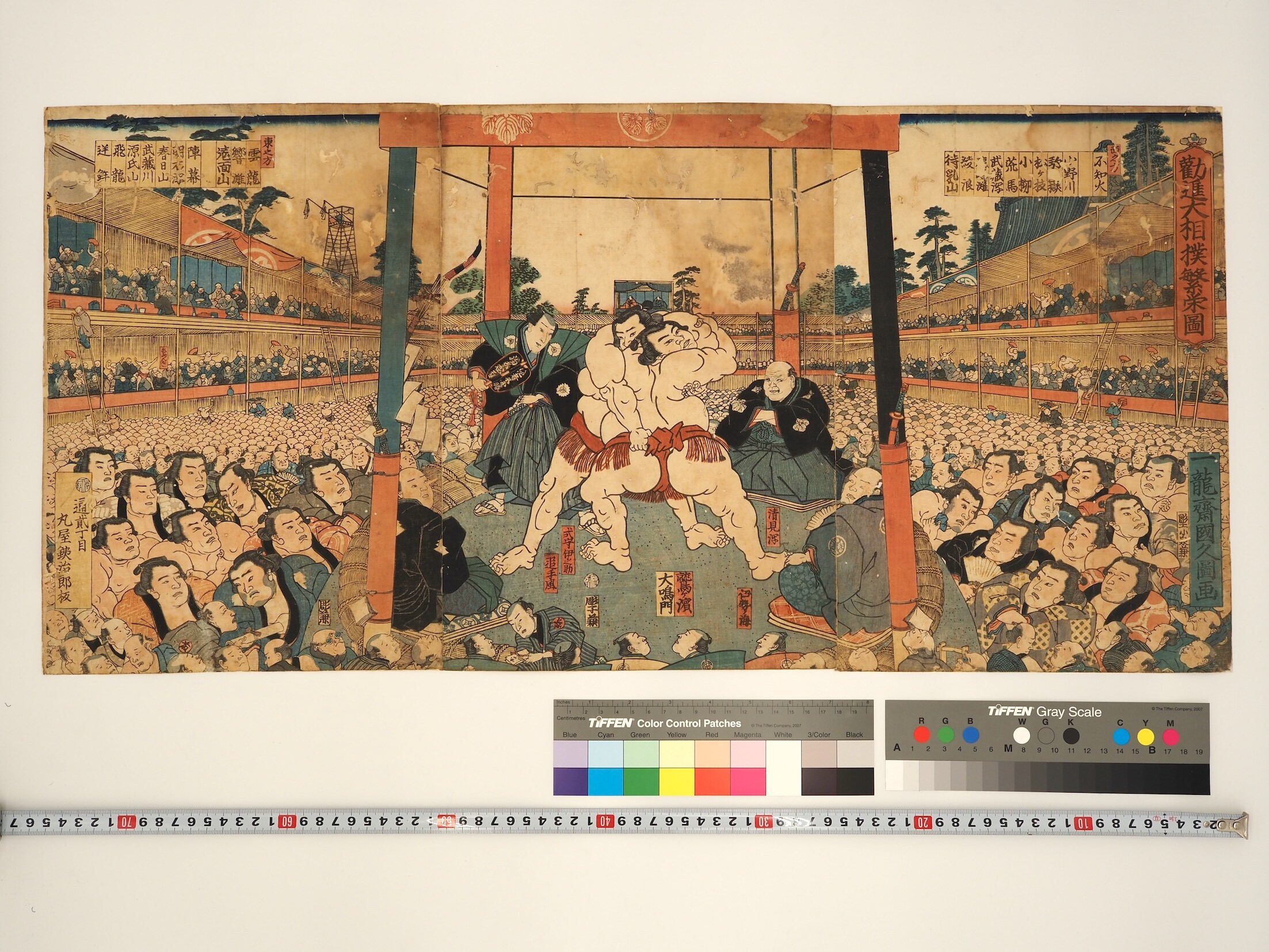 タイトル「勧進大相撲繁栄圖(鷲ヶ浜と大鳴門の取組)」 タイトル「勧進大相撲繁栄圖(鷲ヶ浜と大鳴門の取組)」 NP-10C/歌川 国久(二代)/勧進大相撲繁栄圖(鷲ヶ浜と大鳴門の取組)/丸屋銕治郎/文久2年/A/O/3枚続