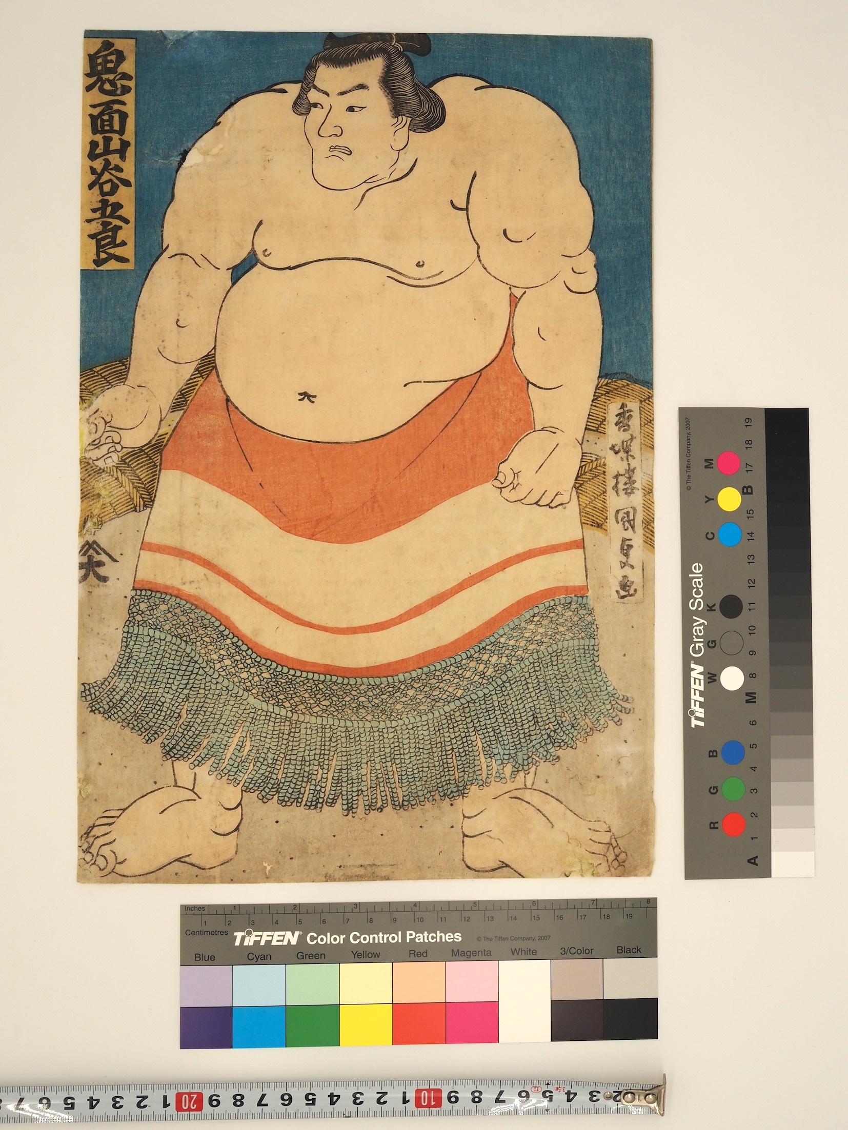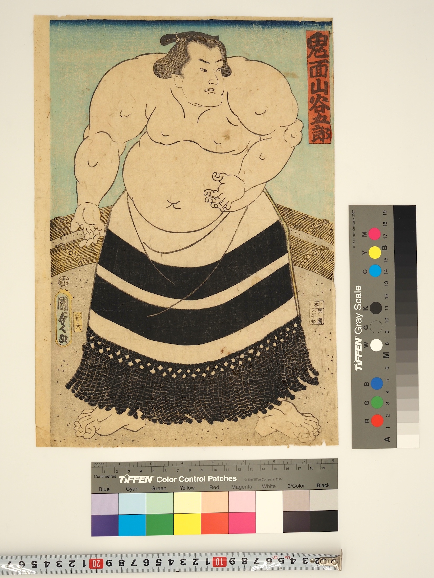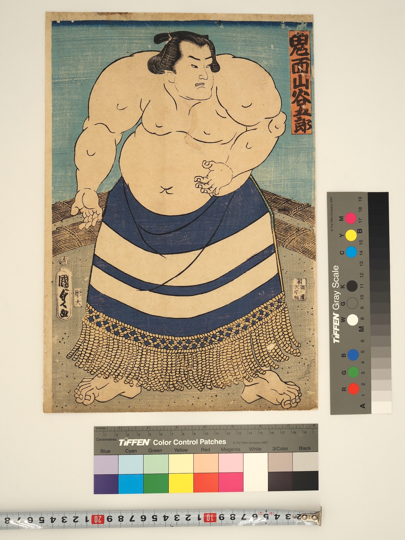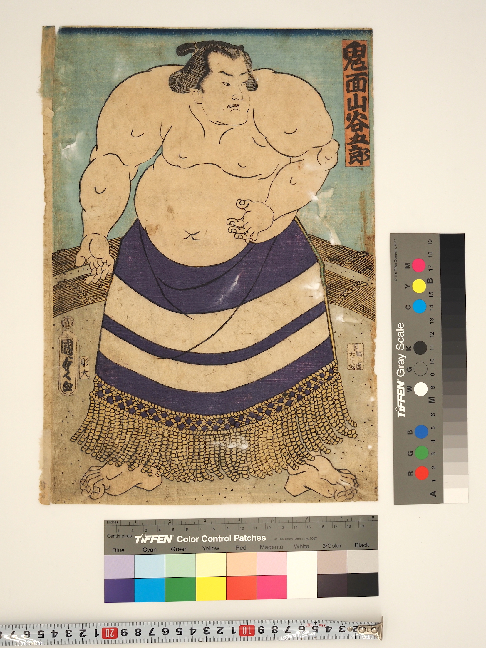 タイトル「鬼面山谷五郎(赤子持二引化粧廻)」 タイトル「鬼面山谷五郎(赤子持二引化粧廻)」 NP-8A-4/歌川 国貞(二代)/鬼面山谷五郎(赤子持二引化粧廻)/上州屋金蔵/文久2年12月/A/O/原版は天保年間の別力士の可能性有