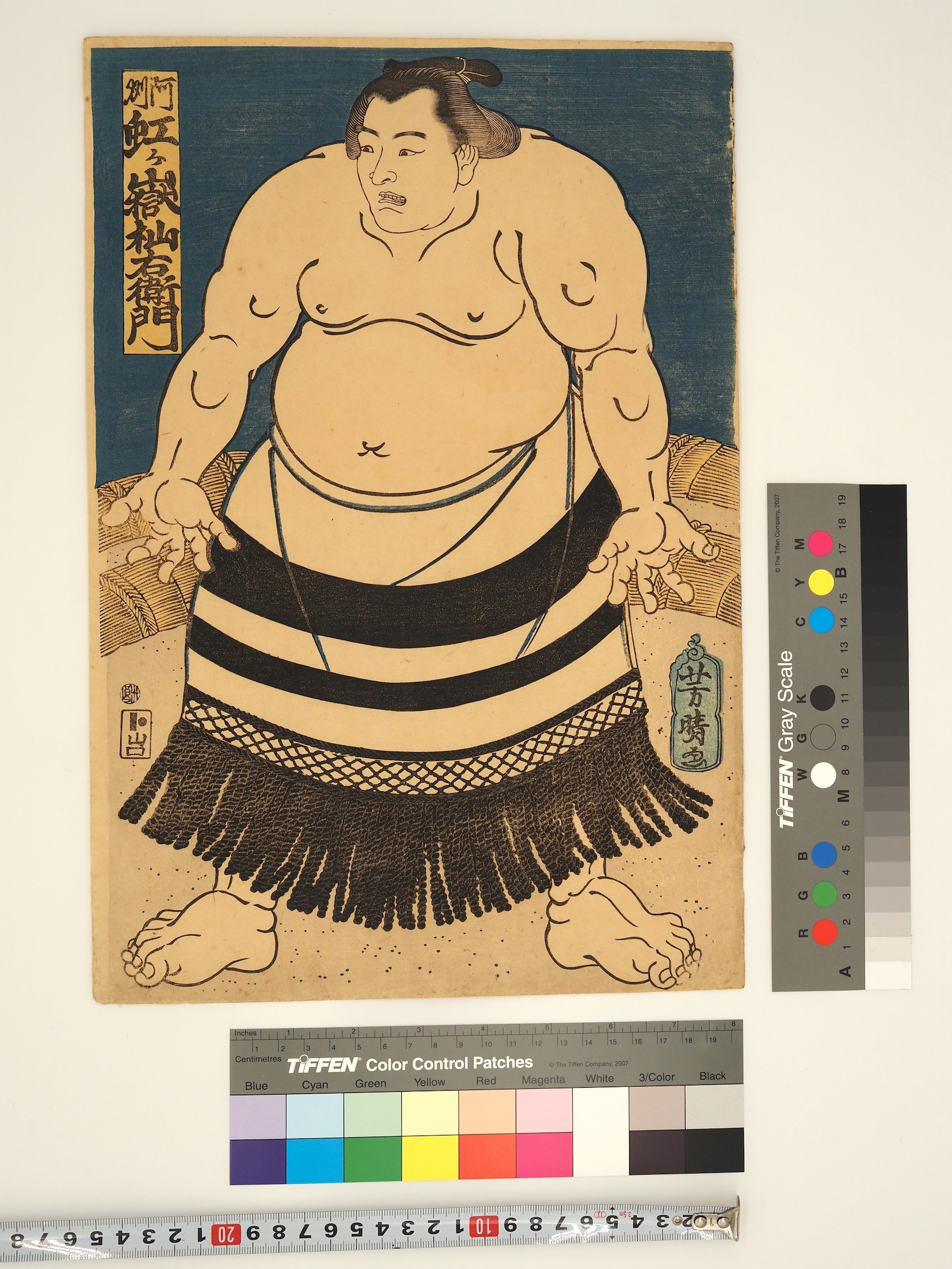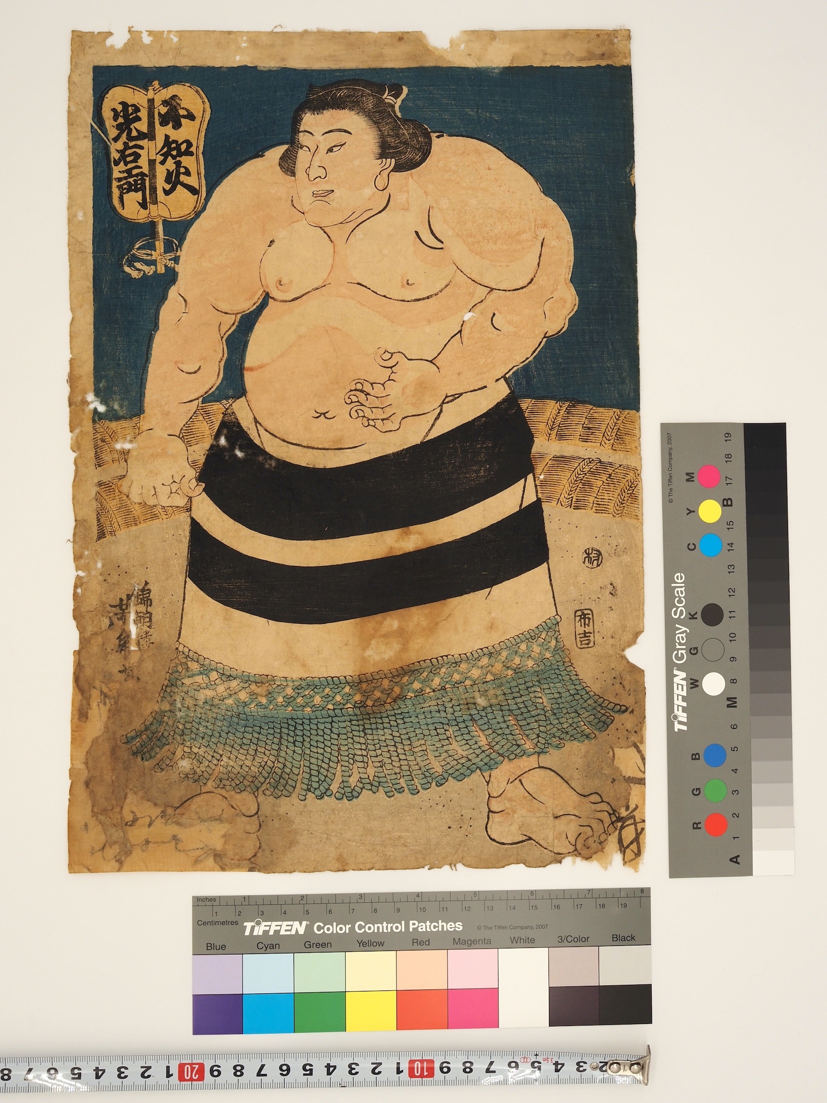 タイトル「不知火光右衛門(肥後熊本藩化粧廻)」 タイトル「不知火光右衛門(肥後熊本藩化粧廻)」 NP-12B-2/歌川 芳虎/不知火光右衛門(肥後熊本藩化粧廻)/布吉/安政5年頃/A/O/弘化年間の別力士版木から改版の可能性有