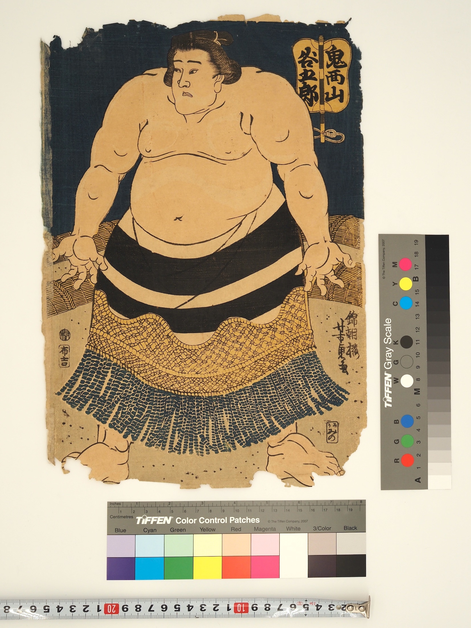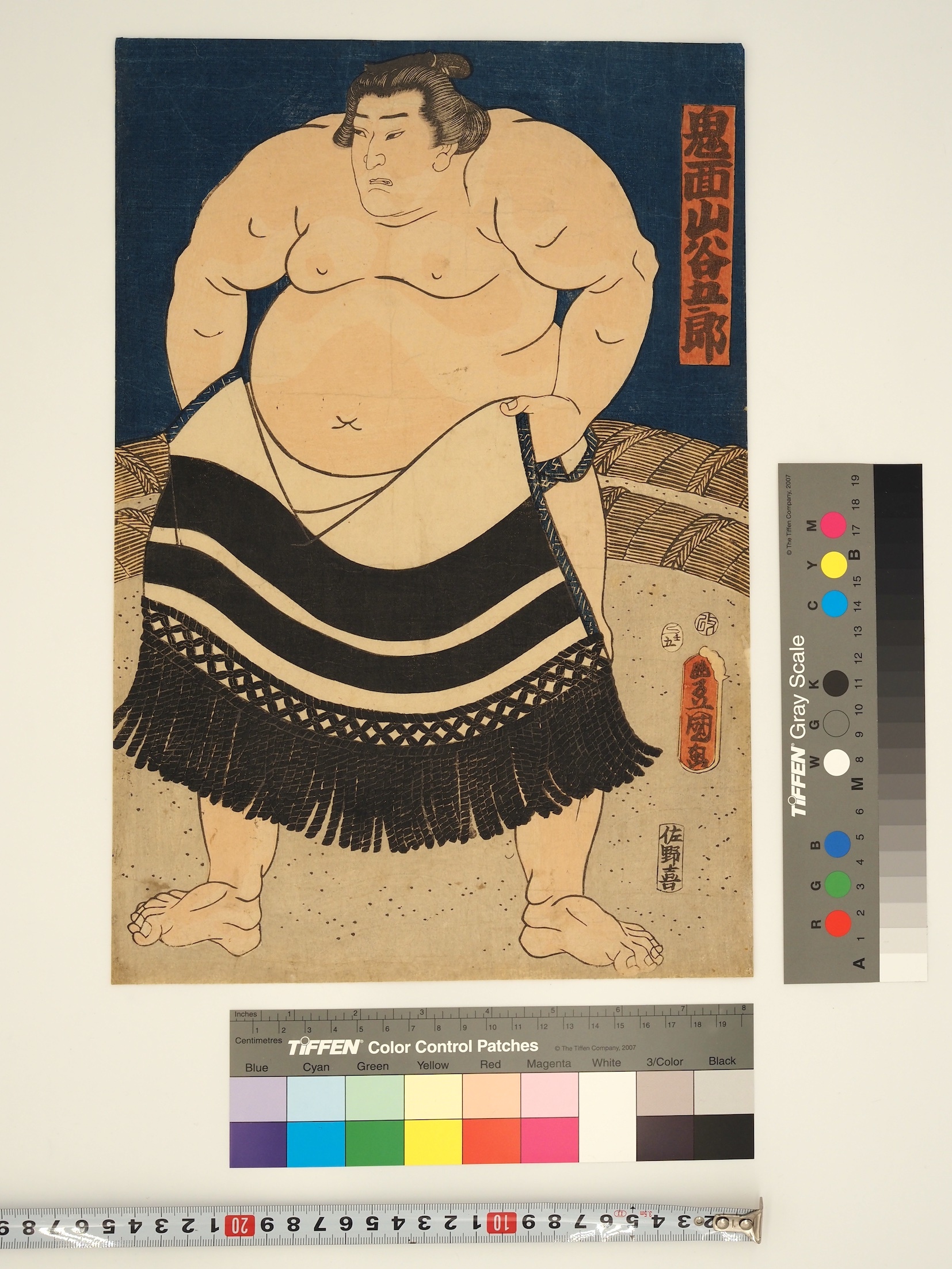 タイトル「鬼面山谷五郎(阿波徳島藩化粧廻)」 タイトル「鬼面山谷五郎(阿波徳島藩化粧廻)」 NP-8A-1/歌川 芳虎/鬼面山谷五郎(阿波徳島藩化粧廻)/布吉/安政5年頃/A/O/弘化年間の別力士版木から改版の可能性有