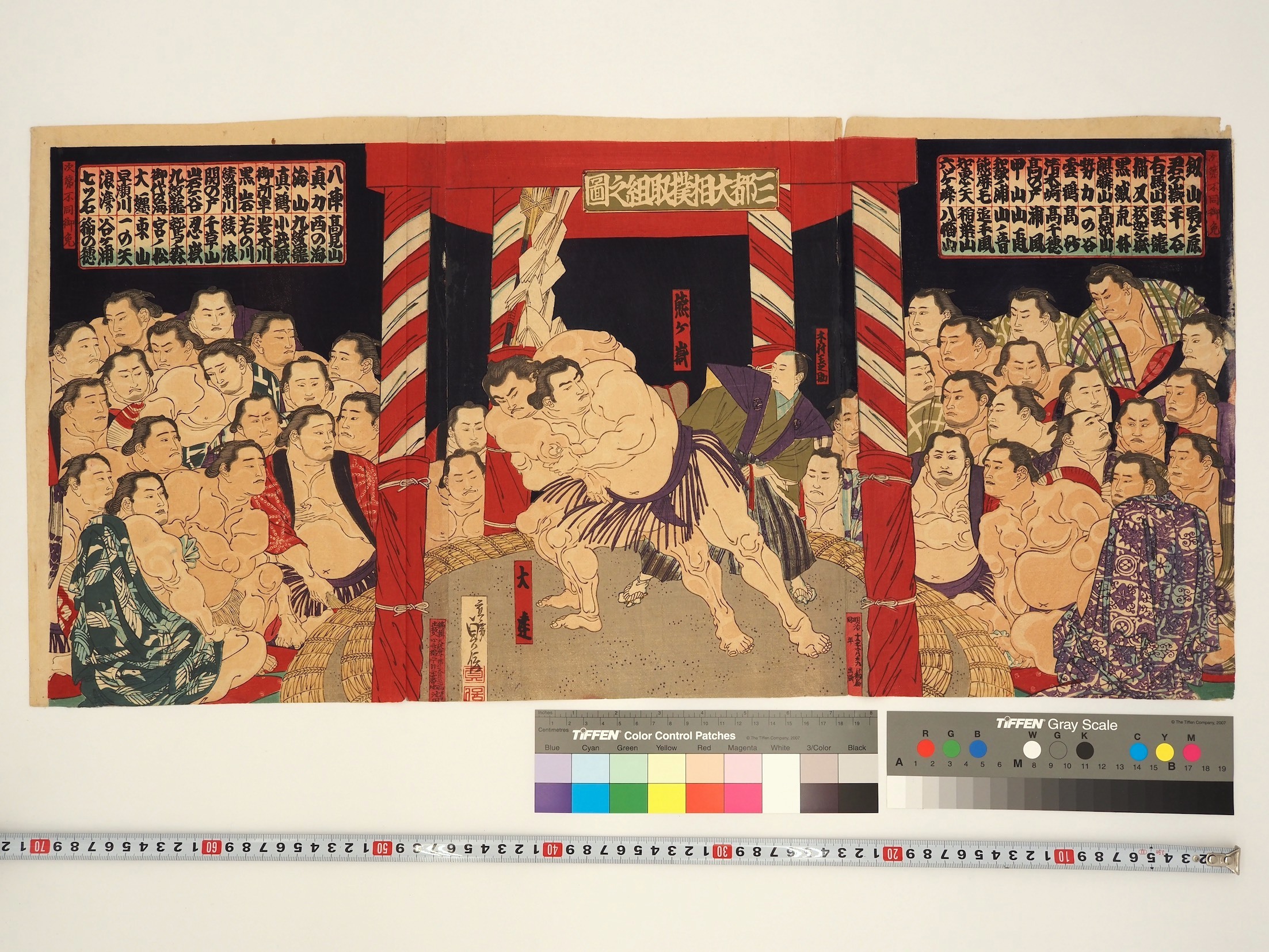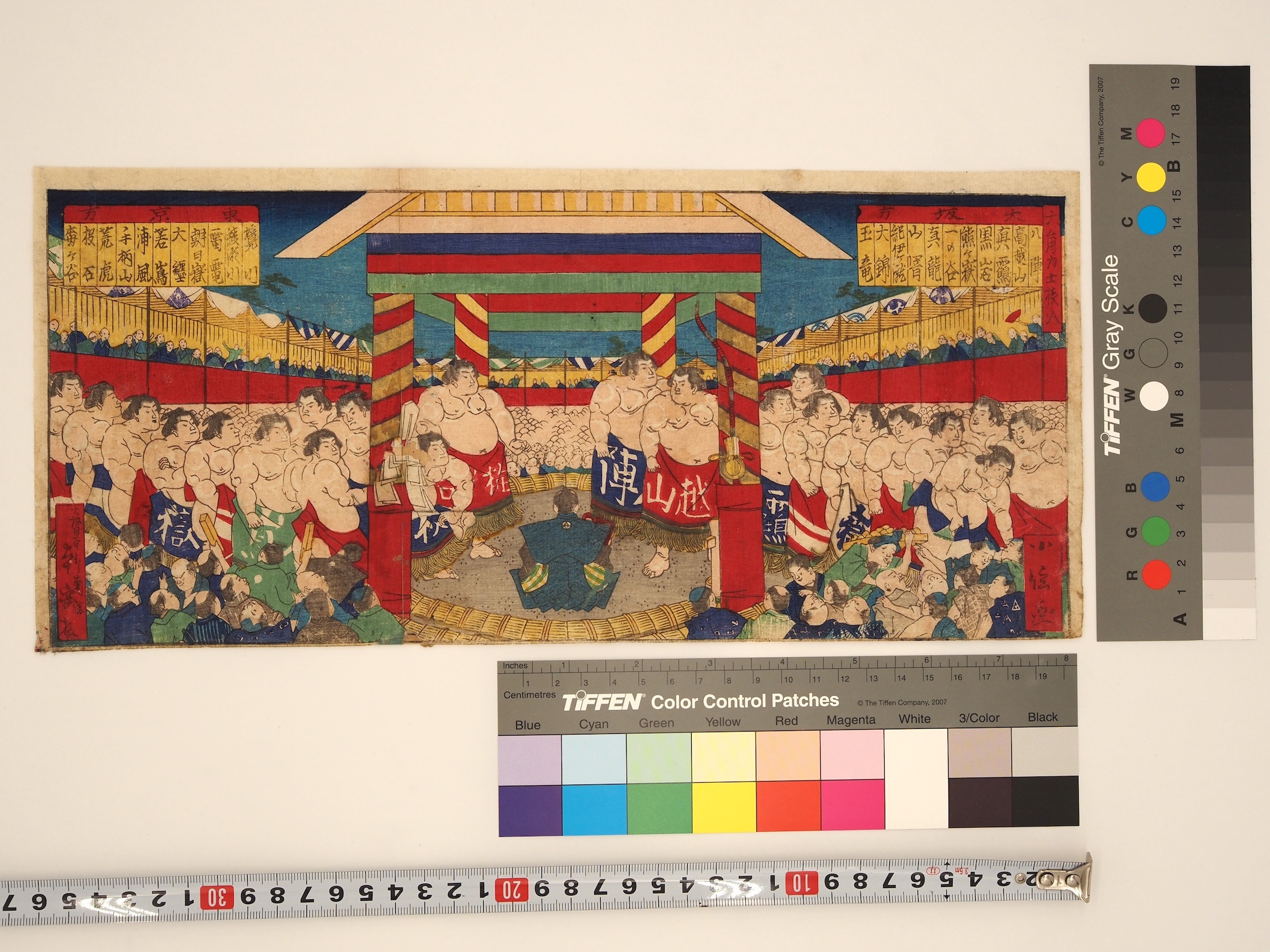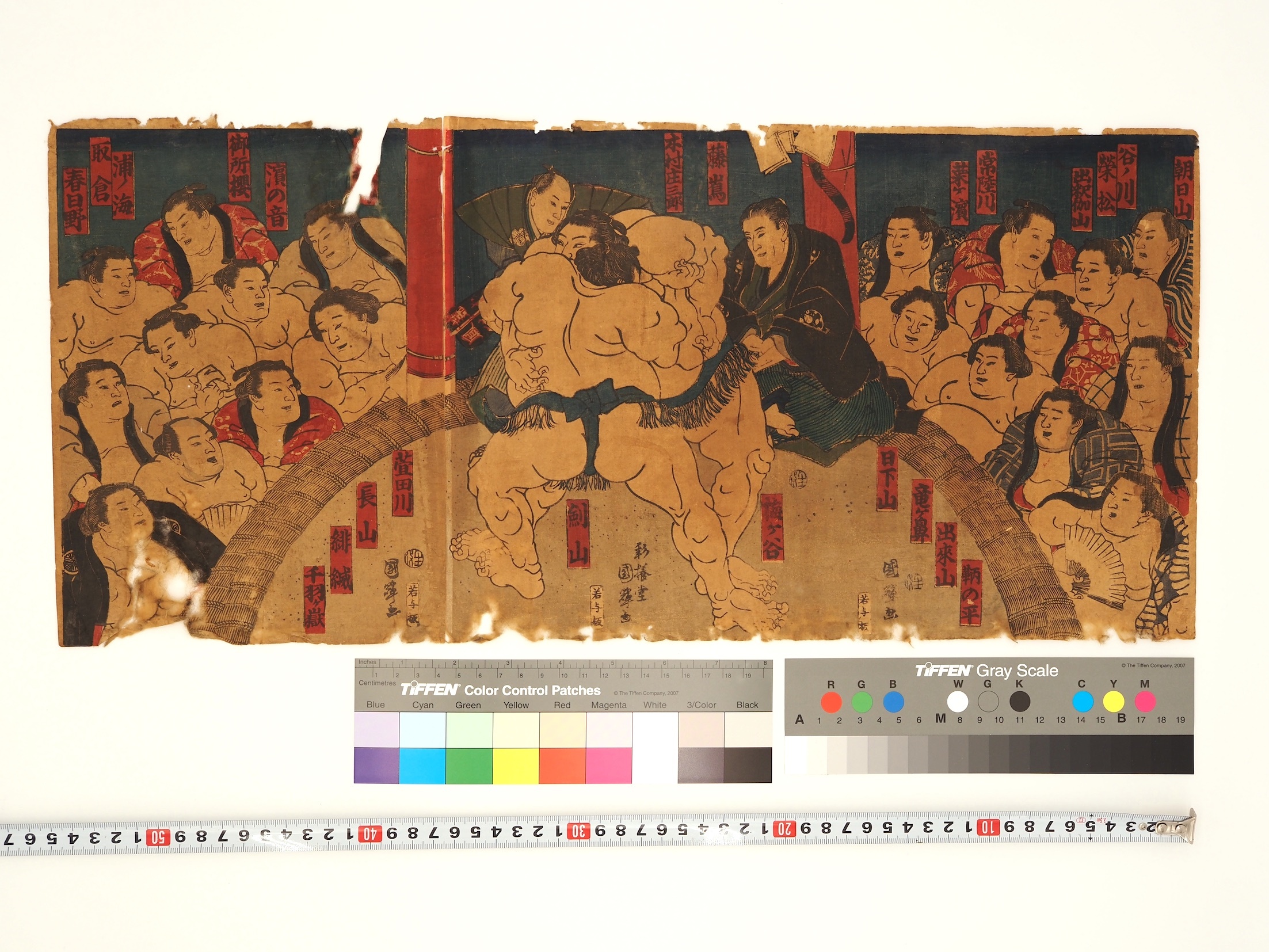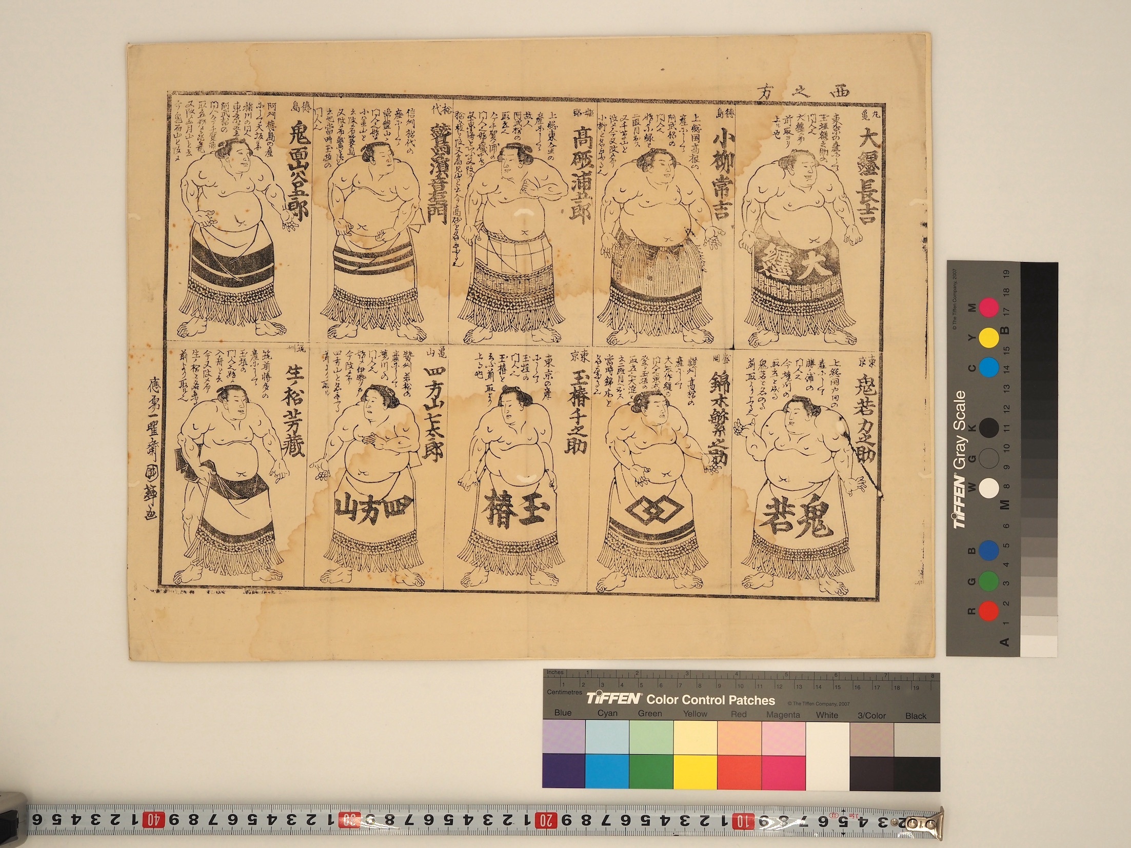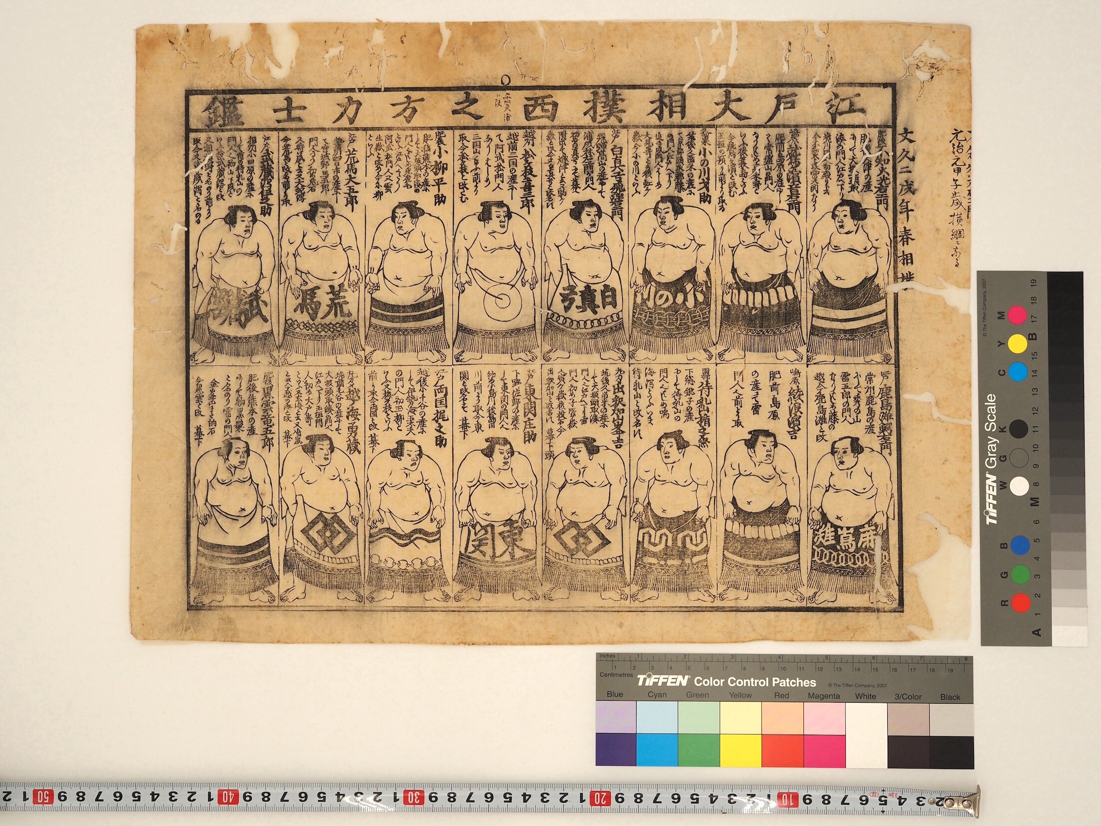 タイトル「江戸大相撲 東之方/西之方 力士鏡 (西方)」 タイトル「江戸大相撲 東之方/西之方 力士鏡 (西方)」 P6-3A-1, 2/不詳/江戸大相撲 東之方/西之方 力士鏡/不詳/文久2年2月/A/O/絵番付