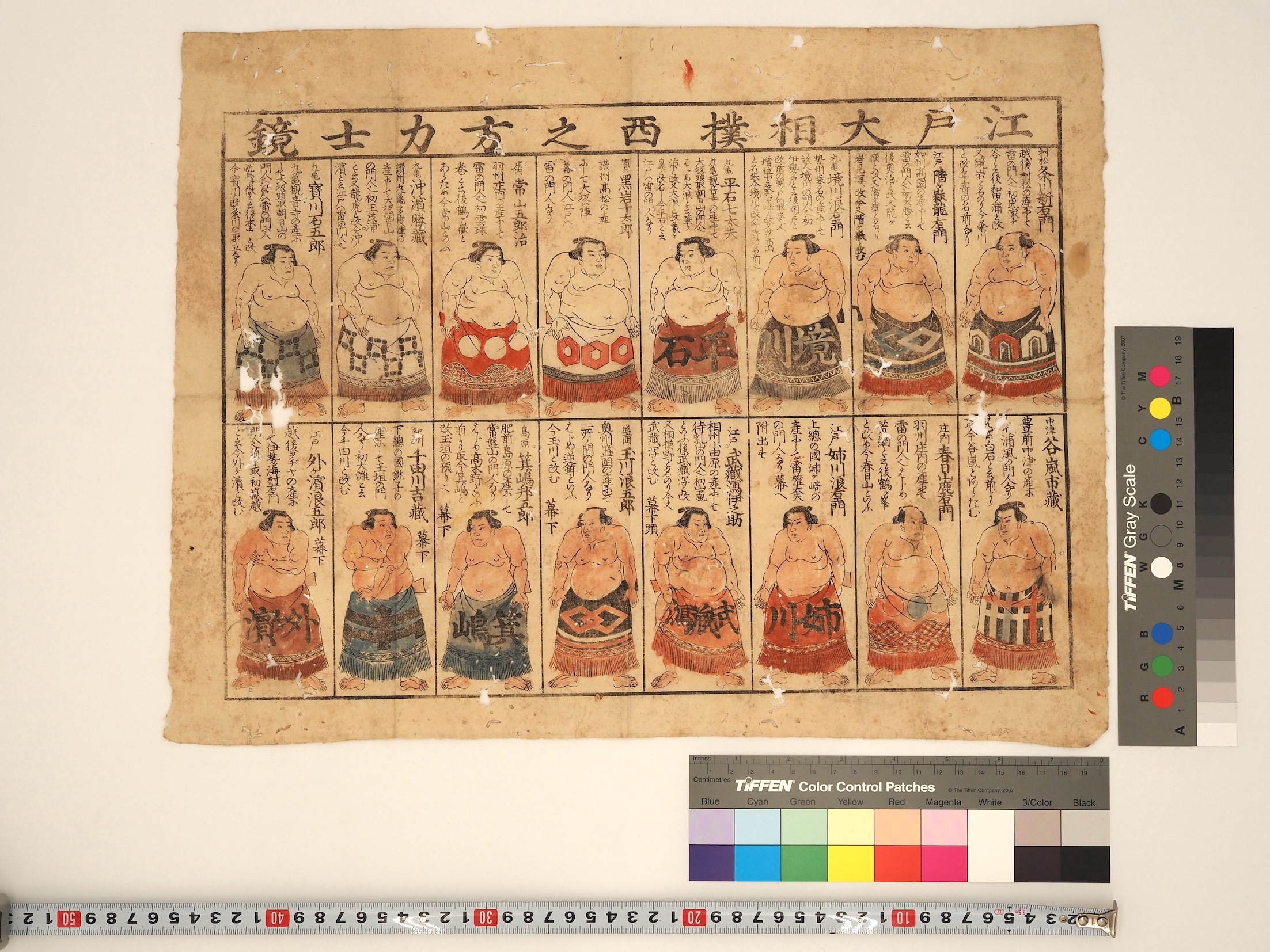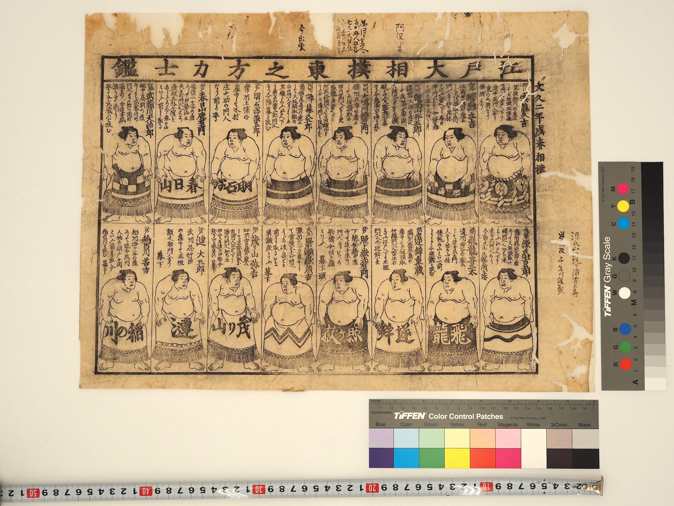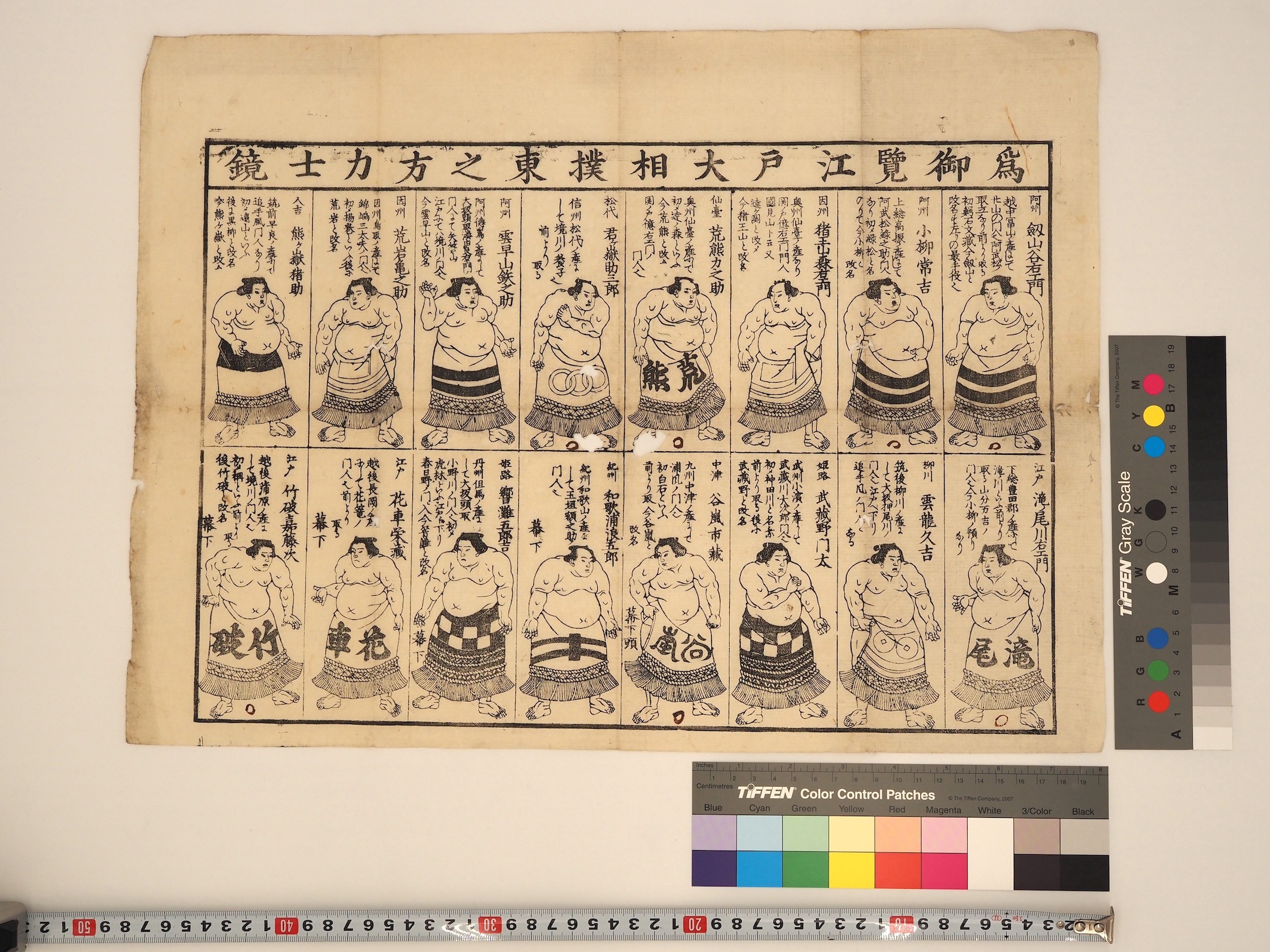 タイトル「江戸大相撲 東之方/西之方 力士鏡 (東方)」 タイトル「江戸大相撲 東之方/西之方 力士鏡 (東方)」 P6-3A-1, 2/不詳/江戸大相撲 東之方/西之方 力士鏡/不詳/文久2年2月/A/O/絵番付