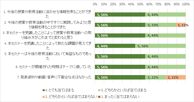 参加者アンケートを行った結果、「5. 本セミナーは今後の教育活動において有益なものであった」という設問において、概ね肯定的な回答 (「とても当てはまる」「どちらかといえば当てはまる」の合計) を得ることができた。また、その他の項目についても概ね肯定的な評価を得ることができた。