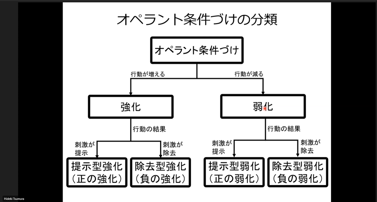 授業参観では、津村先生の授業「学習・言語心理学」のうち、「学習の過程にかかわるオペラント条件づけの基本原理」の回について参観を行った。