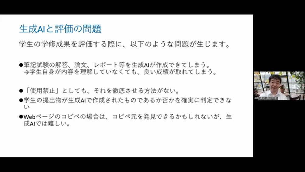 その後、教育における生成AIの使用について、文部科学省事務連絡「大学・高専における生成AIの教学面の取扱いについて(https://www.mext.go.jp/content/20230714-mxt_senmon01-000030762_1.pdf)」等を引用しながら、各大学で生成AIの活用に関するガイドラインの作成が求められていることや、生成AIが学生の主体的な学びを妨げないこと、とくにレポート等に安易に使用することで学生自身の学びにつながらないだけでなく、剽窃や盗用にあたる可能性があること等が言及されていることの説明がなされた。さらに生成AIを利用する上で発生しうる著作権上の問題について、文化庁の作成した資料に基づく説明があった。最後に、生成AIはほとんどすべての授業おいてレポートなど学習の評価に影響を与える可能性があることに対して注意喚起があり、また、その問題の対処方法について大阪大学SLiCSセンター教育学生支援部門「評価における生成AIの影響(https://www.tlsc.osaka-u.ac.jp/project/generative_ai/assessment_ai.html)」を引用し、生成AIに対応した評価方法のアイデアが紹介された。最後に講師から今後の生成AIをめぐり留意すべきと考える点が示され、その後参加者からの質疑応答が行われた。