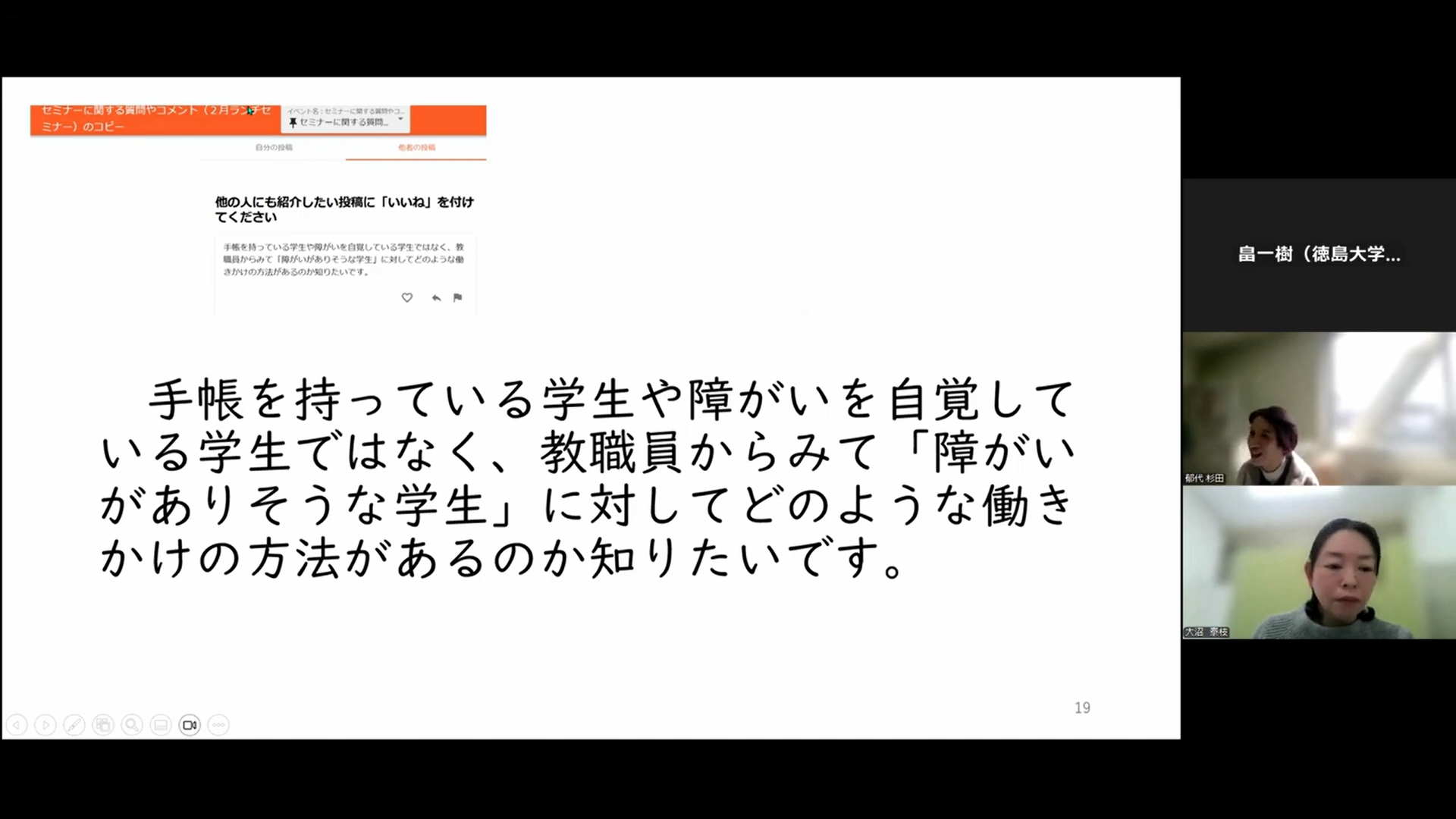 第2回は香川大学・徳島大学における学生支援部署・キャリア教育担当部署の教員が登壇し、主に障害のある学生のキャリア支援としてそれぞれの大学でどのような取り組みがなされているかについて紹介がなされた。