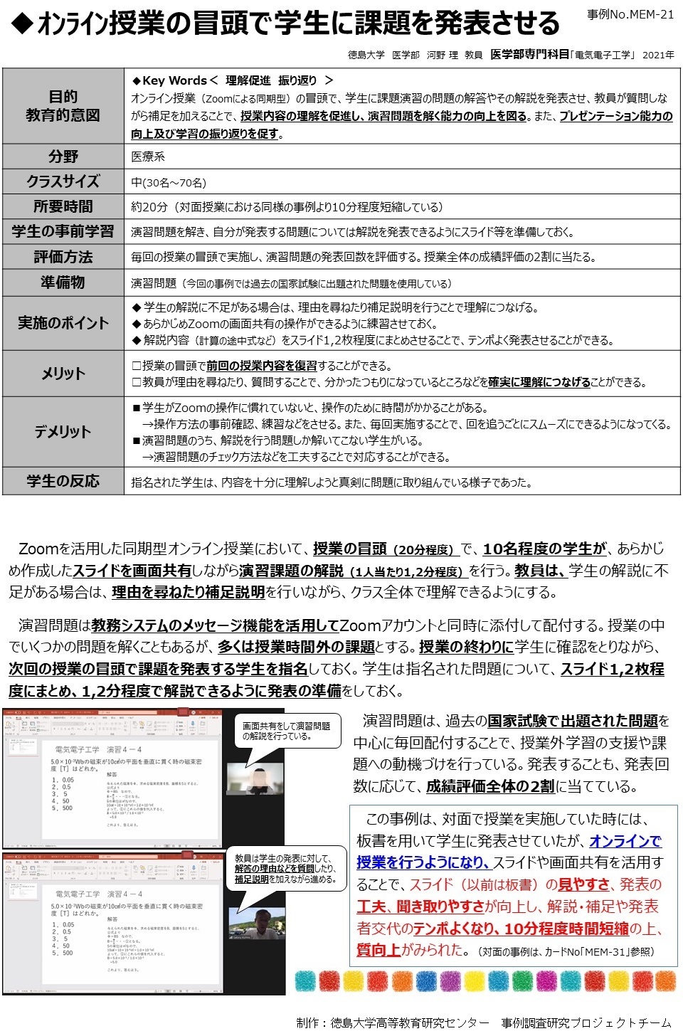 - オンライン授業の冒頭で学生に課題を発表させる(MEM-21)