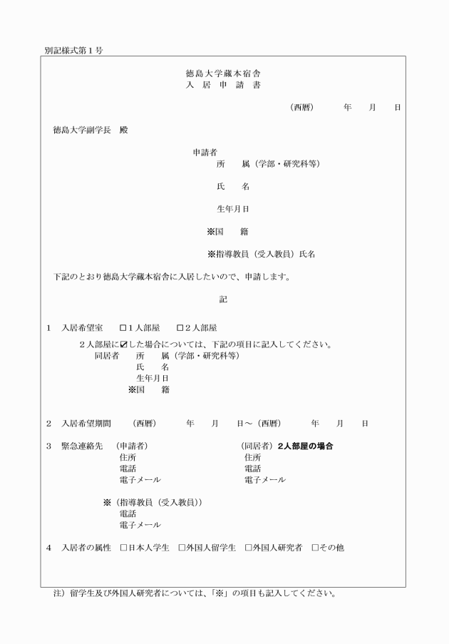2 入居希望者が国外にいる場合は、代理人(徳島大学の教員に限る。)による申請を認めることがある。