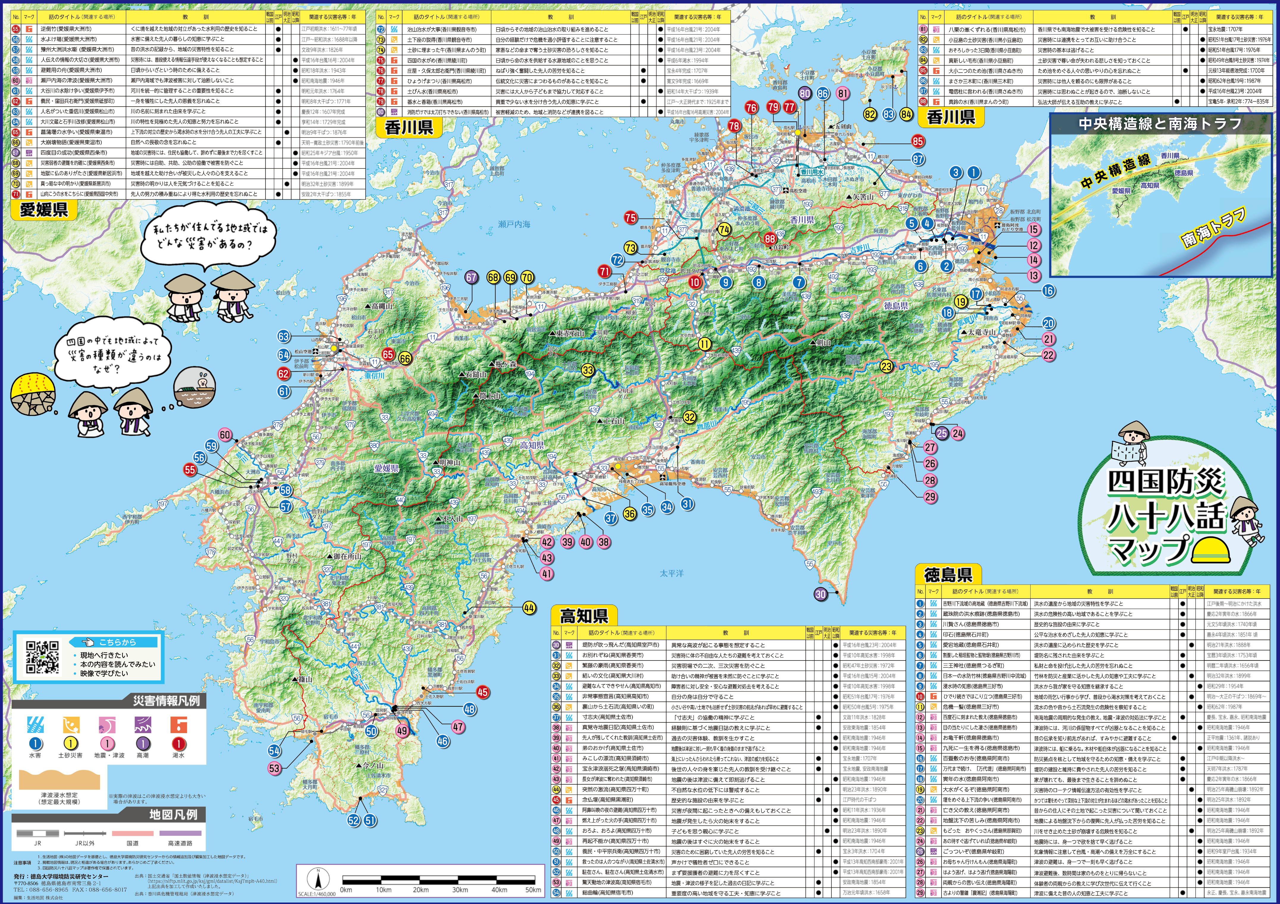 「~先人の工夫や知恵に学ぶ~四国防災八十八話」マップには,四国各地に残された災害に関する言い伝えや体験談がまとめられています.本マップは,四国防災八十八話を知り,その場所に行って”学ぶきっかけ”となるように,一般社団法人四国クリエイト協会の協賛を得て,四国防災八十八話・普及啓発研究会が企画し,徳島大学環境防災研究センターが発行したものです.令和3年に徳島版,令和4年に香川版,令和5年に高知版,令和6年に愛媛版を発行しました.