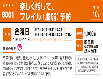 時事問題、経済、歴史、文化、文学、スポーツ等に関する現代社会の変化を受講者が共有し、話すことで知的好奇心を刺激して脳トレとなります。話すことで社交性も芽生え、社会参加を意識することによりフレイル予防につなげます。