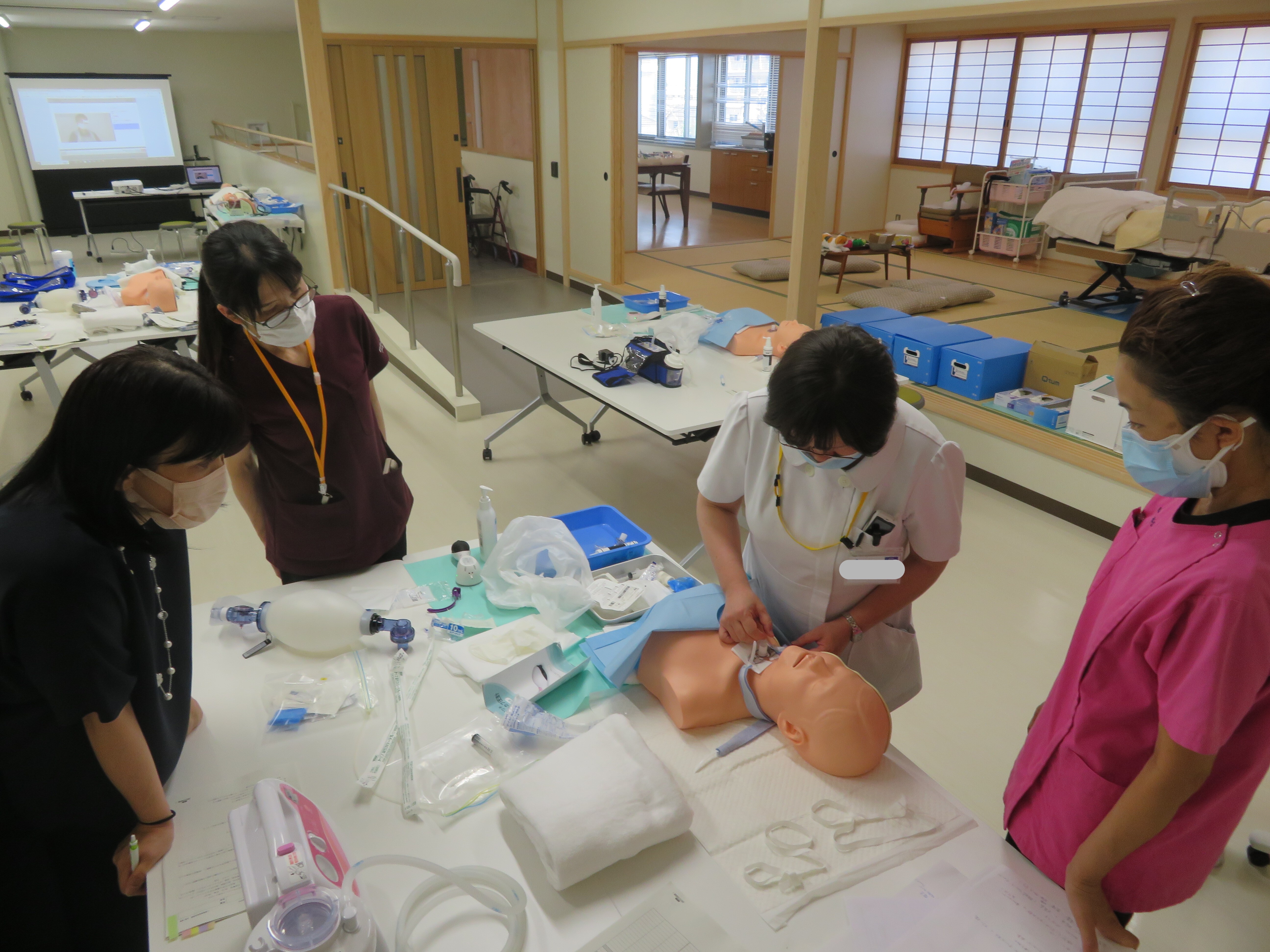 在宅・慢性期領域「区分別科目」 7月25日に「呼吸器関連」の授業を徳島大学医歯薬学共創プラザ内「在宅ケアスペース」で行いました。 シミュレータを用いて、eラーニングで復習をしながら受講者は学修を進めています。 呼吸器関連の授業の様子