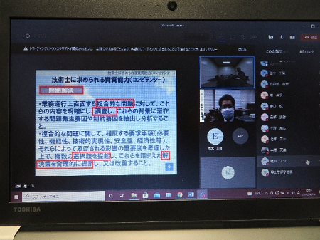 講演会では現在の仕事の内容や、技術士に求められる資質能力等についてお話があり、今春から就職する学生や、